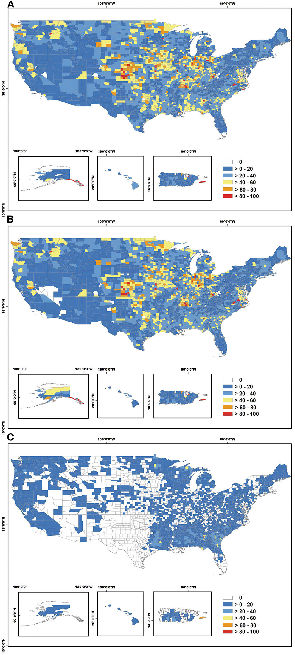 4. Finally, we categorized practices using adaptive strategy principles, which consider management strategies along a continuum of change to the ecological structure and function of the agroecosystem (Walthall et al., 2013). Resistance strategies require the least change in agroecosystem form and function and are typically reactive interventions that target specific threats with technological tools, for example the addition of irrigation in areas experiencing more frequent and intense drought or increased use of pesticides in an area experiencing higher pest pressures. Financial tools such as subsidized insurance and disaster relief are also included in Resistance strategies. Resilience strategies change the form and function of the agroecosystem in order to buffer the effects of disturbances and support a rapid return to a healthy condition after a disturbance, with no or minimal management intervention. Resilience strategies are typically proactive interventions that increase the functional and response diversity of the agroecosystem and reduce risks associated with multiple threats. For example, the adoption of soil health practices like cover crops and more diversified crop rotations buffer the effects of more variable rainfall, spread production risk across a variety of crops, reduce year-to-year yield variability, and can enhance profitability (Walthall et al., 2013). Transformation strategies facilitate the transition to a new agroecosystem with substantially different structure and function better suited to sustained production under current or projected conditions. Transformation strategies are typically proactive interventions designed to better position the agroecosystem to sustain production over the long term and reduce risks associated with multiple threats. These strategies also tend to produce multiple benefits to the producer and the local community (Figure 1D). For example, transitioning a conventional row crop operation in a floodplain to a managed grazing operation reduces the risk of flood damage to the operation, enhances regional water quality, and can also reduce the risk of downstream flooding (Basche, 2017). This resistance-resilience-transformation framework was recommended for use in an ecosystem-based approach to agricultural adaptation (Easterling, 2009). It has been applied to climate risk management planning in U.S. National Forests (Spies et al., 2010; USDA Forest Service, 2010) and the National Fish, Wildlife, and Plants Climate Adaptation Strategy (NFWPCAP, 2012), and is used to categorize adaptation options in the USDA Climate Hub's Adaptation Workbook (Janowiak et al., 2016).