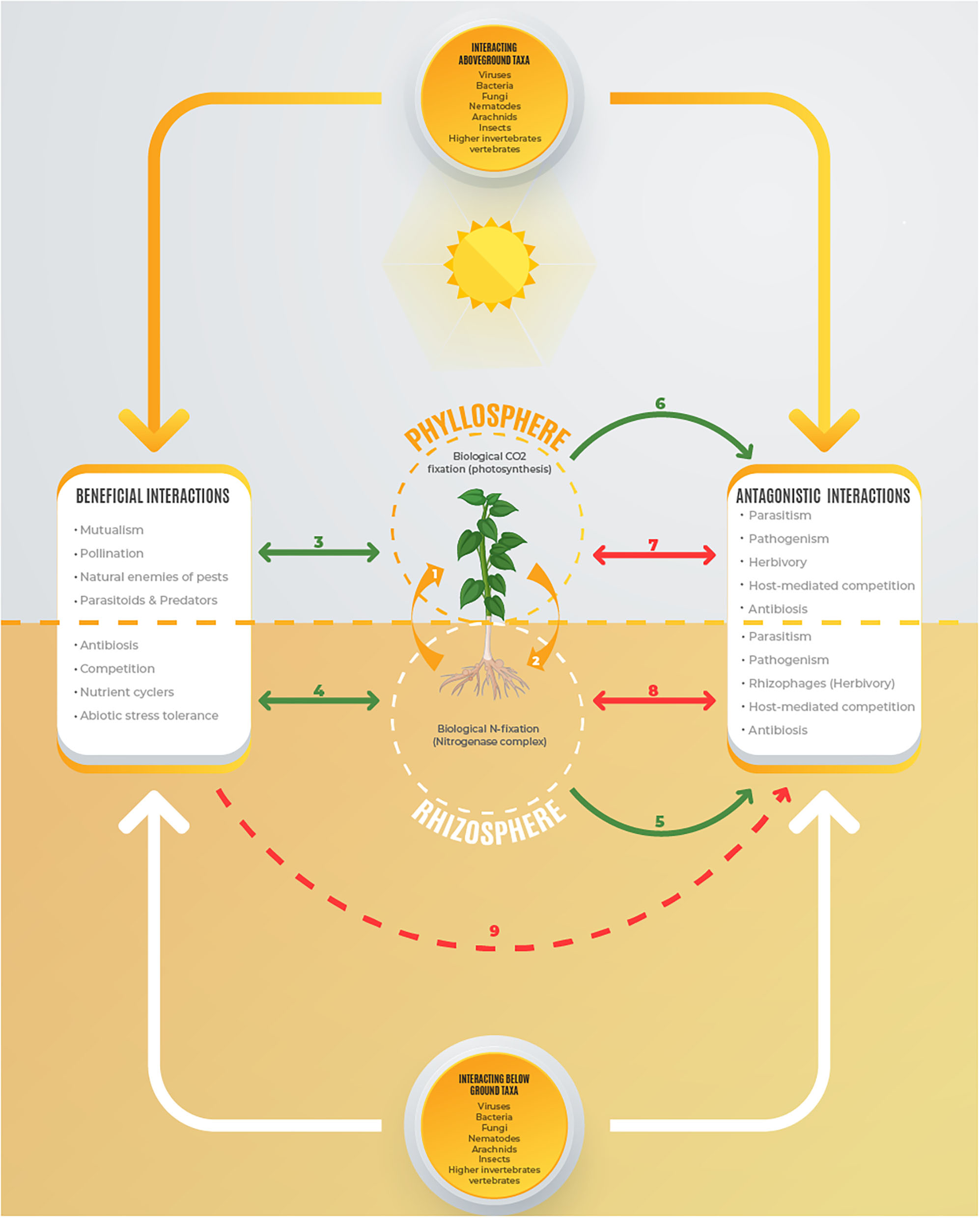 Leguminous plant with Rhizobium-nodulated roots. (1) The aboveground foliar system obtains gaseous CO2 from the phyllosphere and fixes it into organic compounds through photosynthetic machinery and translocate them to the heterotrophic rhizobia in the root nodules; (2) Rhizobium obtains nitrogen from the rhizosphere and fixes it into amino acids that are transmitted to the leguminous leaves for protein and chlorophyll synthesis; (3, 4) Beneficial mutualistic interactions between rhizobial plants with aboveground and belowground taxa with the autotroph providing organic carbon derived from photosynthesis and nitrogen fixation. (5, 6) The rhizobia plants providing food to antagonistic organisms under a situation of warfare (7, 8) and (9) beneficial biota help the rhizobial plant to suppress the antagonistic organisms.