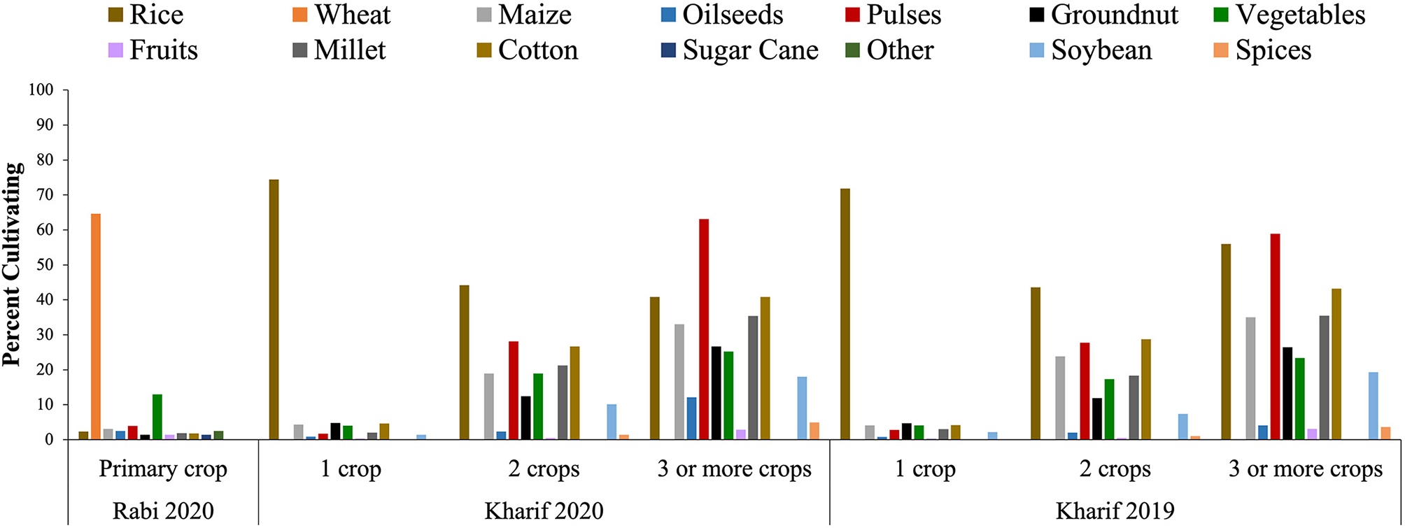 This analysis focused on survey questions relating to cropping patterns and diet. Questions on cropping patterns were adapted from Government of India surveys (Ministry of Statistics and Programme Implementation, 2013; Agriculture Census, 2016) with input from agricultural experts. Respondents reported cultivated land area in local units, and these were converted to hectares. At baseline (Rabi), we only asked about the primary crop harvested (defined as the crop for which the participant made the most money) and the total land harvested for that crop. During follow-up, we asked about all different types of crops sown and the land sown for each of these crops in Kharif 2020 and 2019. Given the distribution of the number of crops cultivated in Kharif (Supplementary Figure 1), we categorized participants as cultivators of 1 crop, 2 crops, or 3 or more crops. The primary exposure variable was crop diversity category in Kharif 2020.
