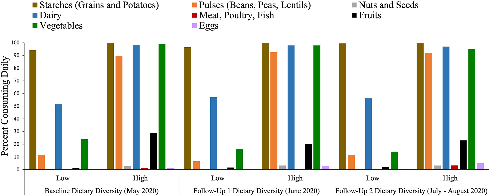 We used dietary diversity in our assessment because it is an important predictor of adequate nutrient intake and a proxy for diet quality (Miller et al., 2020). Questions on diet were derived from the FAO's Minimum Dietary Diversity for Women (MDD) (FAO, 2016). Eight food groups were included: (1) starchy staples (rice, wheat, and potatoes), (2) pulses, (3) nuts, (4) vegetables, (5) fruits, (6) dairy, (7) eggs, and (8) fleshy foods (meat, poultry, and fish). Vegetables and fruits were not divided further into dark green leafy vegetables and vitamin A-rich fruits and vegetables vs. other vegetables and fruits because we were conducting telephone interviews and had to simplify the survey as much as possible to maximize participant engagement and data quality. Those who consumed a food group every day in the past week were assigned a value of “1” and those who did not were assigned a value of “0” and the values across these eight food groups were summed. Thus, the dietary diversity score ranged from 0 to 8 with 8 representing maximum dietary diversity. Low dietary diversity was defined as MDD <4 and high dietary diversity was defined as MDD >= 4. The two primary outcomes were changes in dietary diversity from (1) baseline to follow-up 1 and (2) follow-up 1 to follow-up 2, categorized as no change, decrease, or increase.