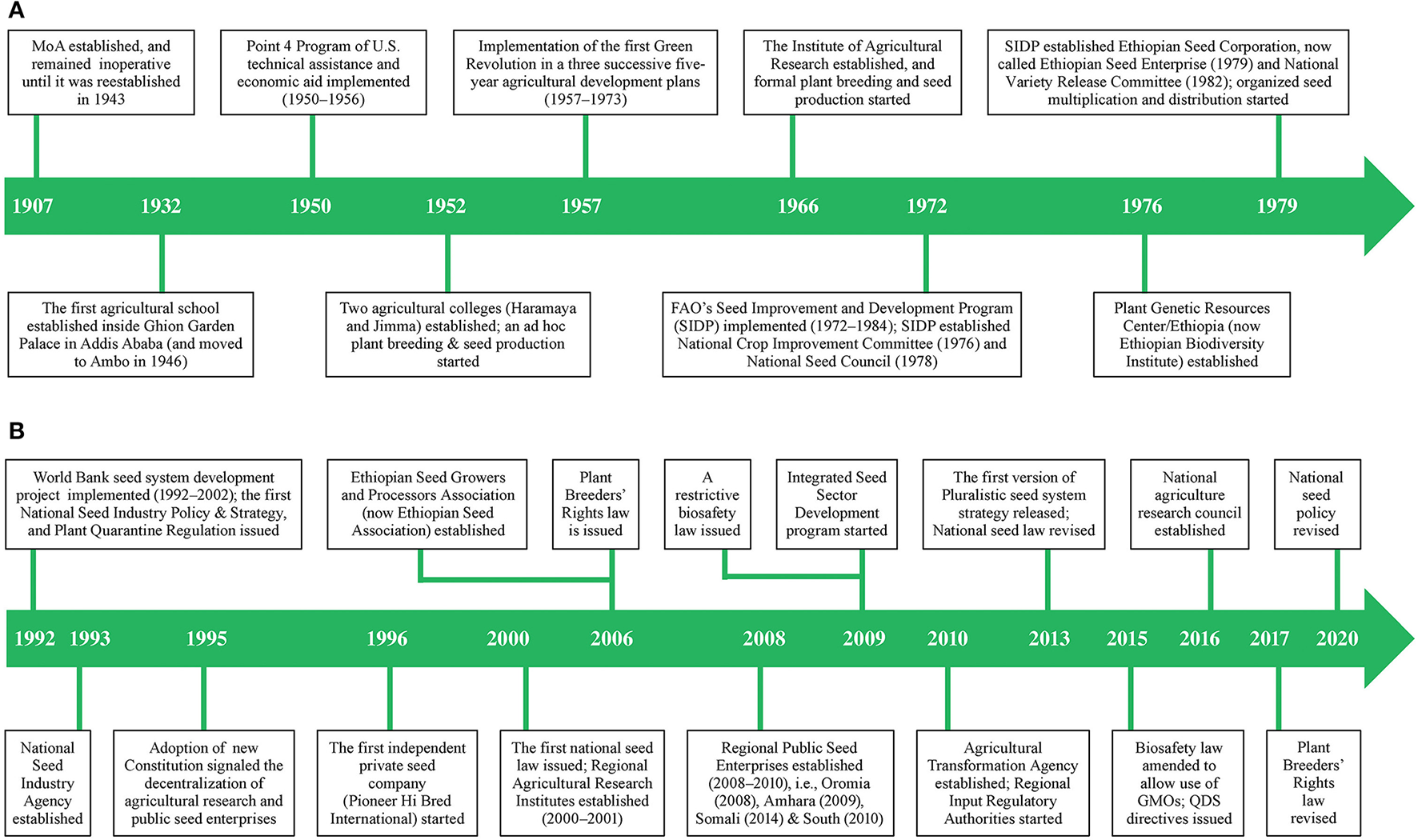 Figure 1. Timeline of major historical landmarks of the Ethiopian seed system policy and institutional developments during (A) the imperial (1889–1974) and socialist (1974–1991) governments, and (B) the developmental state government regime after 1991.
