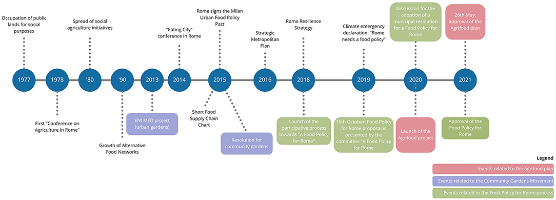 The dialogue between politics and territorial actors has resulted in a series of more structural and organic policies, which, in recent times, have been intensifying, as a sign of greater attention from the institutions. Figure 2 traces the main stages of these policies, showing three important processes, which have been selected as the focus of this research's analysis: Community Garden Movement, Food Policy for Rome (FPR), and Agrifood Plan, which will be described in the following sections. As Figure 2 shows, they have all been developing in the city of Rome in the past years and represent three different processes all involving the topic of food and food policies.