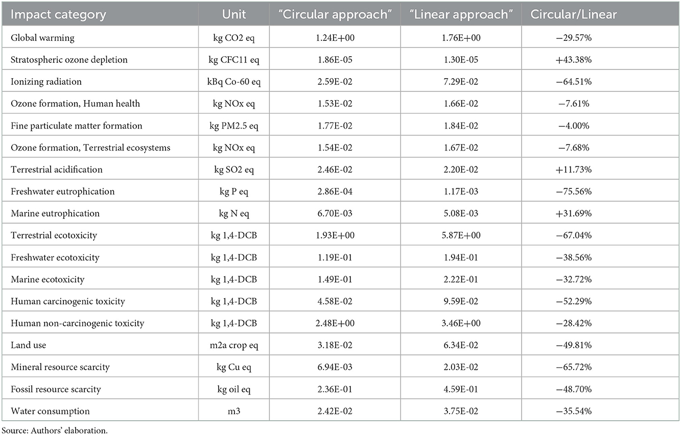 The application of the LCA methodology has made it possible to show how much and in which manner the environmental profile of a product is changed for the better or the worse by adopting circular strategies. The subsequent application of the Material Circularity Indicator made it possible to assess the degree of circularity of the innovative scenario compared to the linear one, but without giving any indication of the environmental impacts. It is clear that in the assessment of circular strategies it is not enough to assess only the degree of circularity, just as it is not enough to assess only the environmental impacts: an integrated assessment of the two environmental aspects is required, adding also the assessment of the economic and social aspects. Starting from these assumptions, it is important to first check the robustness of the results. By comparing the environmental profile of the linear scenario with some EPD-certified oils, it was possible to observe substantial comparability for the impact categories in common between the EPD method and the Re.Ci.Pe. method (Global warming, Terrestrial acidification, Freshwater eutrophication). Considering that one liter of oil is equivalent to 916 gms, simply multiply our results by 0.916 to scale the values to the same Functional Unit used in EPD certifications (1 l of EVOO). It should also be considered that only upstream and core process impacts should be calculated, excluding bottling impacts. In terms of “Global Warming,” the linear scenario has an impact of 1.61 kg CO2 eq, which is comparable with both “Monini Gran Fruttato” oil (EPD, 2022) which has an impact of 1.88 kg CO2 eq and De Cecco oil (EPD, 2017) which has an impact of 1.41 kg CO2 eq.