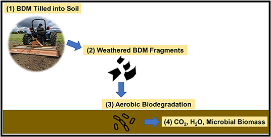 Unlike traditional polyethylene mulch they soil-biodegradable mulches are intended to be tilled into the soil at the end of the cropping season (Figure 5) (Hayes et al., 2019; Serrano et al., 2021). After tillage, soil-biodegradable mulch fragments are designed to be biodegraded by microorganisms and converted into microbial cell biomass, carbon dioxide, and water under oxic or aerobic conditions (Kasirajan and Ngouajio, 2012; Hayes et al., 2019). This reduces the amount of plastic waste generated and offsets the negative impacts associated with the traditional disposal pathways (or lack thereof) of polyethylene mulch made from non-biodegradable polymers. It also reduces the labor costs associated with the removal and disposal processes. Therefore, soil-biodegradable mulches have the potential to serve as a more sustainable and economical alternative to polyethylene mulch.