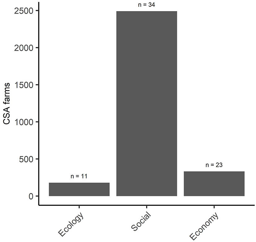 In almost all CSA farms considered, social variables were investigated (Figure 2). Economic and ecological variables were investigated in around 13 and 7% of the farms, respectively. In 169 farms, structural variables were examined including management practices (with or without organic certification), organizational and legal form, which is about 7% of the farms considered.