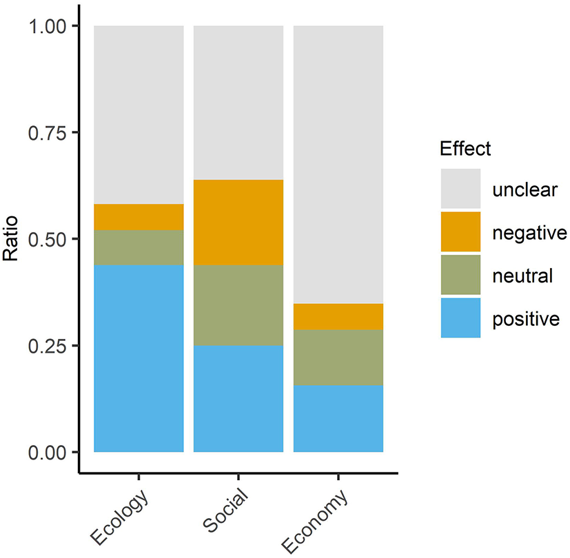 Ratio of investigated variables with positive, neutral, negative or unclear effect in each sustainability dimension comparing CSA and reference systems.