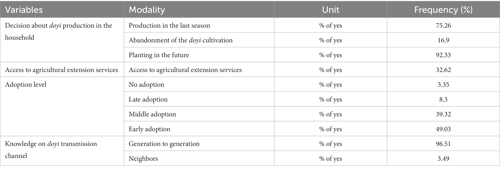 Table 2 shows that 67.78% of doyi farmers did not access agricultural extension services. Those who had access to extension services have it for a few major or staple crops like cotton, maize, and soybean. Farmers’ knowledge about the cultivation of doyi was transmitted to them by their parents in 96.51% of cases. About 75.26% of the respondents produced the crop in the 2018 cropping season. Relative to the adoption rate of improved technology in agriculture, 48.95% of the respondents declared adopting it in early stages and 39.02% were in the category of middle-stage adoption. Only 3.31% declared they avoid changing practices and did not adopt new technologies or practices and preferred to use traditional knowledge.