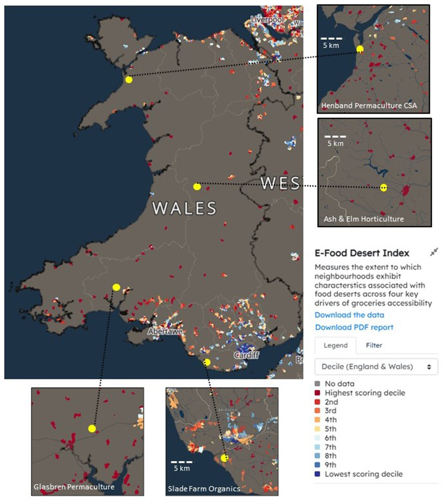 Figure 1. Food desert map for Wales. The yellow circles indicate where our case study farms are based. The e-food desert index (EFDI) is a multi-dimensional composite index for GB which measures the extent to which neighbourhoods exhibit characteristics associated with food deserts across four key drivers of groceries accessibility: (1) Proximity and density of grocery retail facilities (2) Transport and accessibility (3) Neighbourhood socio-economic and demographic characteristics, and (4) E-commerce availability and propensity. Source: mapmaker.cdrc.ac.uk.