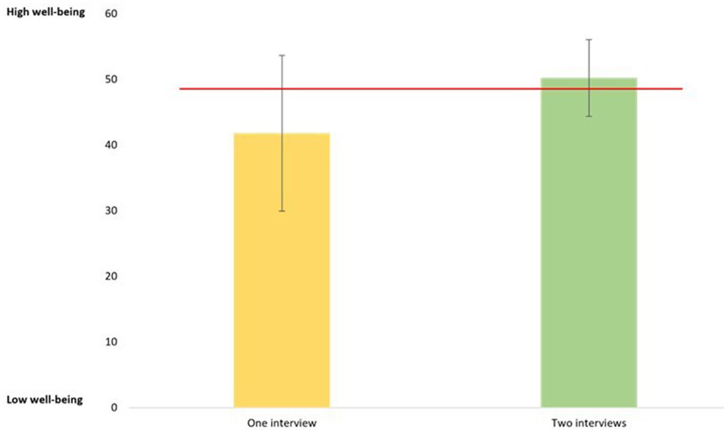 Figure 3. Pre-interview Well-being score for participants that did not complete the study (i.e. only one interview = yellow bar) compared with those who completed the project (i.e. Two interviews = green bar).
