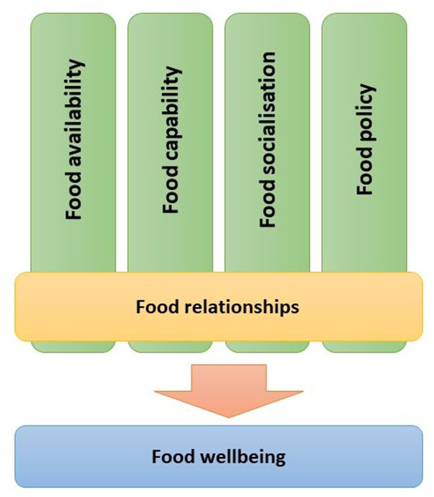 Food well-being is a multidimensional concept that combines perspectives from food security, food sovereignty and individual and social well-being (Gartaula et al., 2017). In a broader sense, it can be defined as “a positive psychological, physical, emotional, and social relationship with food at both the individual and societal levels” (Block et al., 2011, p. 6). As such, food well-being is situated in the wider context of food availability and food (in)security and is a direct outcome experienced by individuals from food consumption and their relationship with the food (Jayashankar and Raju, 2020). Promoting a more holistic approach to food overcomes the shortcomings of any unidimensional understanding, for example food as only health (Block et al., 2011) or as secure production and supply (Gartaula et al., 2017). Voola et al. (2018) emphasized the importance of addressing not only nutritional needs but also factors such as food access, food safety, and the social and emotional aspects of eating when considering food well-being.