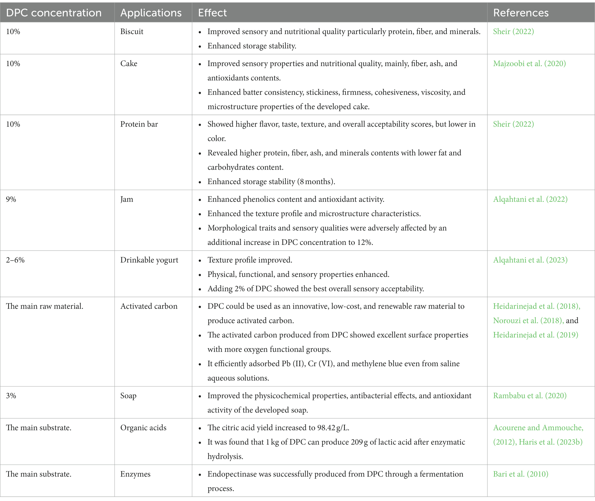Based on the literature, it could be confirmed that DPC is not just a by-product but a promising source of functional ingredients that can be utilized to develop value-added products. According to each component in DPC and the requirements of the targeted product, various valorization plans and engineering possibilities can be suggested and implemented in compatibility with the aim of sustainable development. The food and non-food applications of DPC are mentioned in Table 2.