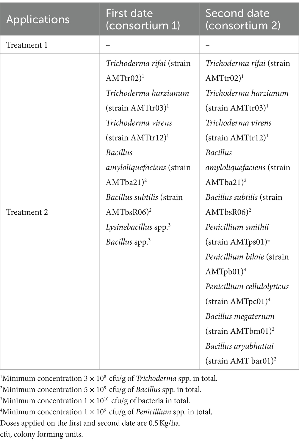 It is also important to highlight that the results presented here correspond to exploratory experiments. These motivate and suggest other questions to be addressed. For example, it is interesting to evaluate if there is a threshold density at which microorganisms begin to have a positive effect on plants. Hence, a subsequent step could involve conducting experiments in which different concentrations of microorganisms are evaluated. Similarly, it is worthwhile to study if there is an optimal concentration for the applications. This last question could be explored using the response surface methodology (Montgomery, 2004). Also, it is compelling to study if there is an optimal structure (e.g., in terms of species richness) for the applied microbial consortia, this question could be explored using treatments of increasing complexity.