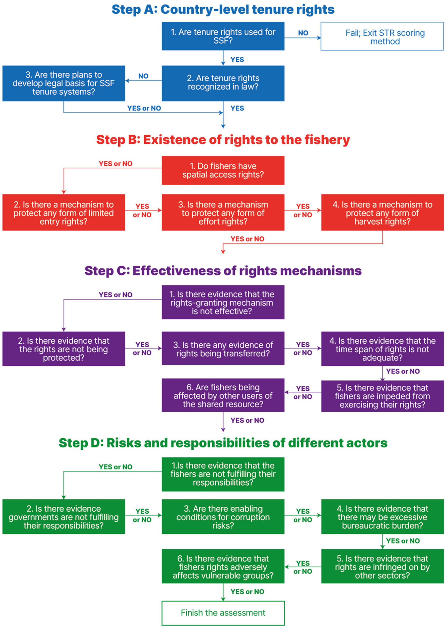 After an extensive literature review, an in-person workshop, and the pilot testing of several fisheries the following scoring methods were drafted to measure the performance of a SSF against the two selected SSFs attributes of STR and PM, STR indicators are assessed first and with greatest emphasis, given the global experience described above that appropriate rights are the fundamental basis for SSFs governance (see recent comprehensive reviews FAO, Duke University and WorldFish, 2023; Gray et al., 2023).