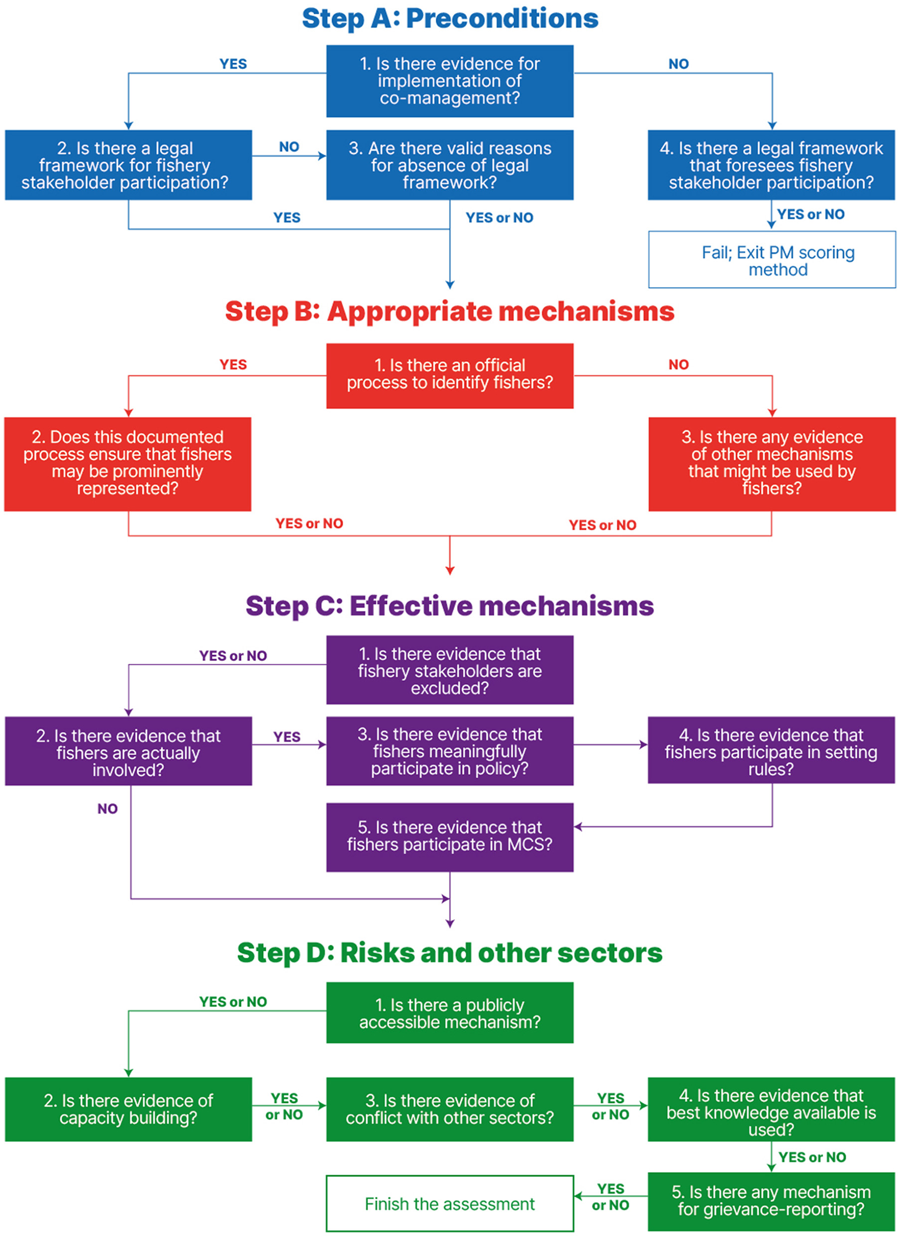 Whenever there is absence of evidence at stage A, the analysis stops and the fishery āfails.ā For the full methods, decision trees, and scoring, refer to Supplementary material 2, 3.