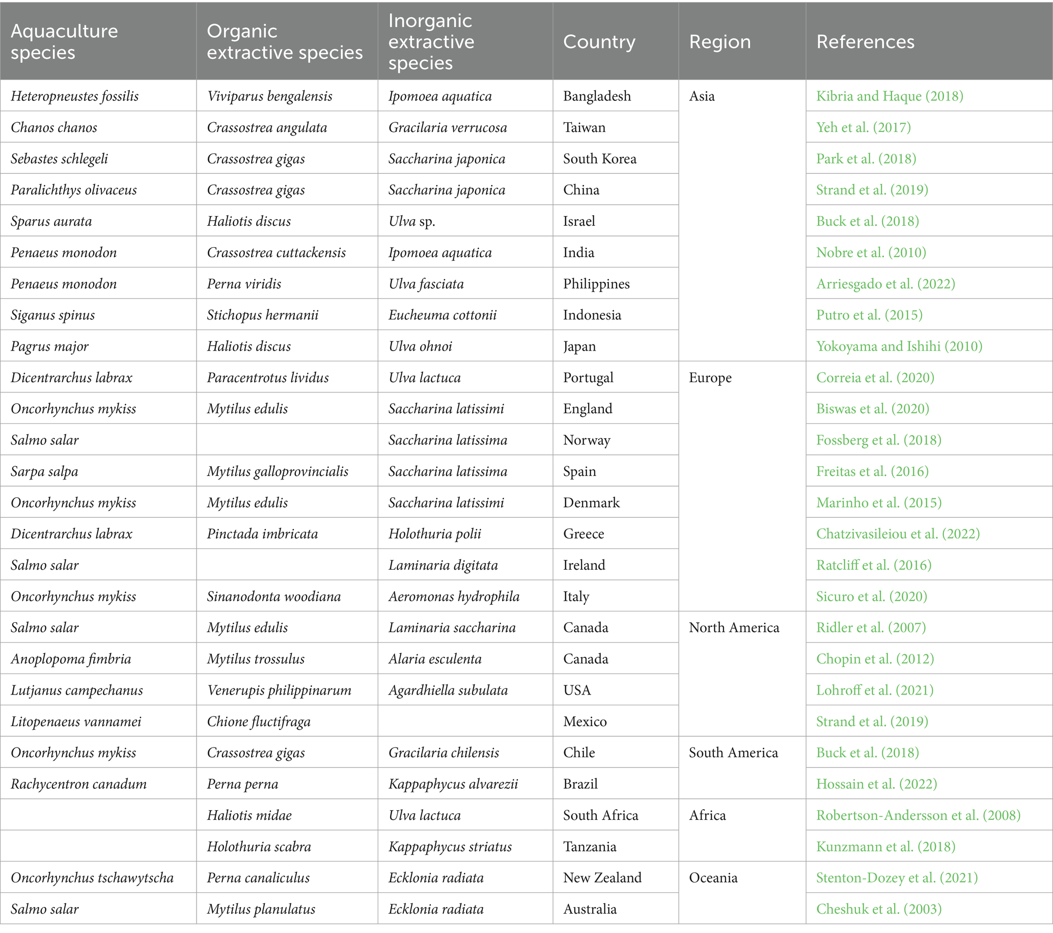 This literature review demonstrated that many organisms may serve as extractive species, but some organisms are more efficient than others. In addition to extraction and bioremediation capacity, the most suitable organisms should ideally also serve as producers of valuable food in IMTA systems (Park et al., 2021; Hossain et al., 2022; Hargrave et al., 2022). Efficient extractive species for organic and inorganic compounds are shown in Table 5. The most efficient extractive species for organic material in IMTA are mussels, oysters, and clams (Chopin, 2011; Diana et al., 2013). Sicuro et al. (2020) made a similar statement, describing bivalves to play a pivotal role in aquatic ecosystems due to their high filtration capacity and ability to recycle nutrients and mix sediments. Earlier studies reported that blue mussels (M. edulis) and other filter feeding bivalves (Diplodon chilensis, M. galloprovincialis) can uptake nitrogen, and reduce levels of chlorophyll a, phosphate, and ammonia (Hossain et al., 2022; Hargrave et al., 2022). Bivalves may consume dissolved compounds (branchial and urinary losses), reducing the concentration of nutrients and preventing the overgrowth of phytoplankton (Papageorgiou et al., 2023). Hargrave et al. (2021) observed that bivalves M. edulis, and Magallana gigas significantly reduced kelp3 biofouling by as much as 50% in IMTA systems. The freshwater mussel, Sinanodonta woodiana is highly efficient for bioremediation since it has been shown to reduce seston (suspended particulate organic matter) loads and regulate eutrophication in waterbodies (Douda and Čadková, 2018). Moreover, in IMTA cultures, the two oyster species, C. gigas and C. rhizophorae efficiently utilized organic matter (fish feed waste and fish feces) and eliminated total suspended solids and chlorophyll-a contents from the waterbody (Ramos et al., 2009; Jiang et al., 2013).