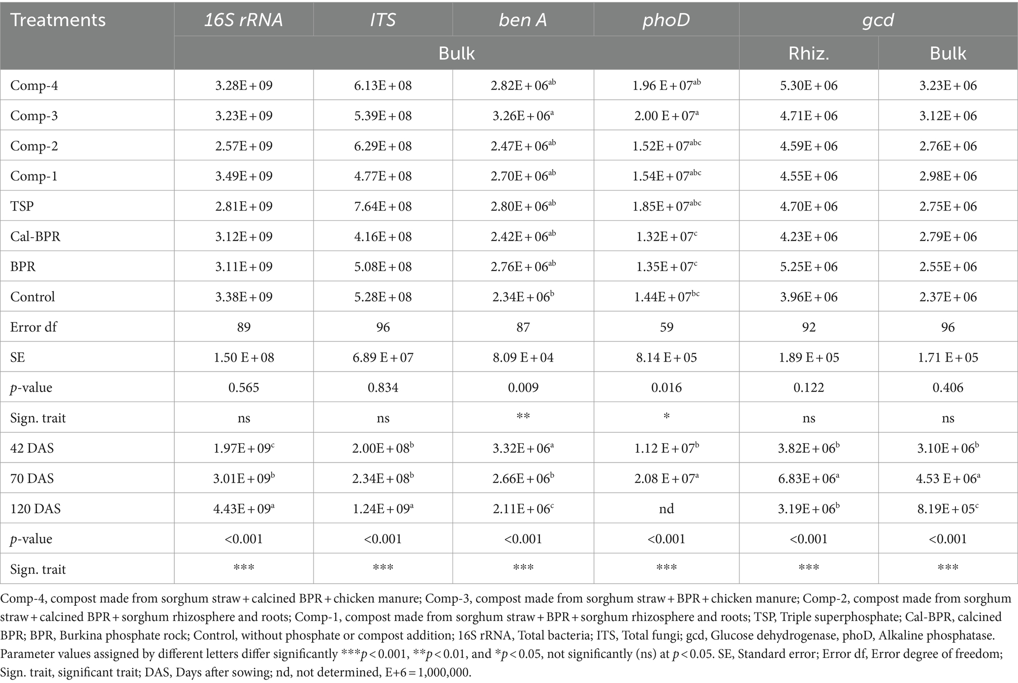 Indeed, the rhizosphere hosts numerous beneficial microbes, including phosphate-solubilizers (Elhaissoufi et al., 2022; Alori et al., 2017), which are nourished by organic compounds released through root exudates, thus supporting their metabolic activity (Shen et al., 2018). Rhizosphere microbial diversity and abundance are affected by root exudates, plant growth stages, and soil chemistry (Xu et al., 2021). In the Comp-4 treatment, increased total bacteria and fungi at specific growth stages likely facilitated the conversion of organic and mineral phosphorus into accessible forms for plants, outperforming other treatments. The abundance of gcd, linked to inorganic P-solubilizing bacteria, showed no difference between the treatments in the rhizosphere and bulk soils. However, it was higher in the rhizosphere, indicating the significance of the P-solubilizing bacteria in this area.