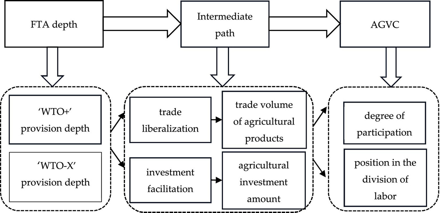 In summary, compared to the manufacturing and service sectors, AGVC demonstrates greater regional specificity, perishability of products, and an emphasis on primary products in relation to the depth of FTAs. Consequently, FTAs with greater depth can more effectively promote the international circulation of agricultural products, enhance the competitiveness of processing and value-added segments, and facilitate the transition from primary production to higher value-added stages, securing a more advantageous position within GVC. Furthermore, deep FTAs strengthen the participation of agricultural enterprises in the AGVC. Trade liberalization and investment facilitation serve as significant channels for these impacts, with their mechanisms illustrated in Figure 1.