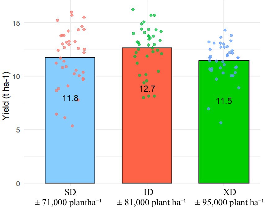 Analysis of mean performance indicated that grain yield varied significantly with increasing population density. The evaluation of maize hybrids across three population densities: 71,000 plants ha−1 (SD), 81,000 plants ha−1 (ID), and 95,000 plants ha−1 (XD) revealed significant differences in agronomic traits, which are critical for maximizing yield (Figure 1). Specifically, the ID population at 81,000 plants ha−1 outperformed both the SD and XD populations, producing 11% more yield. Statistical analysis showed that the ID population achieved an average yield of 12.85 t ha−1, which was significantly higher than the yields of the SD (11.54 t ha−1) and XD (11.79 t ha−1) populations. These results indicated that an intermediate plant population density is optimal for maximizing maize yield.