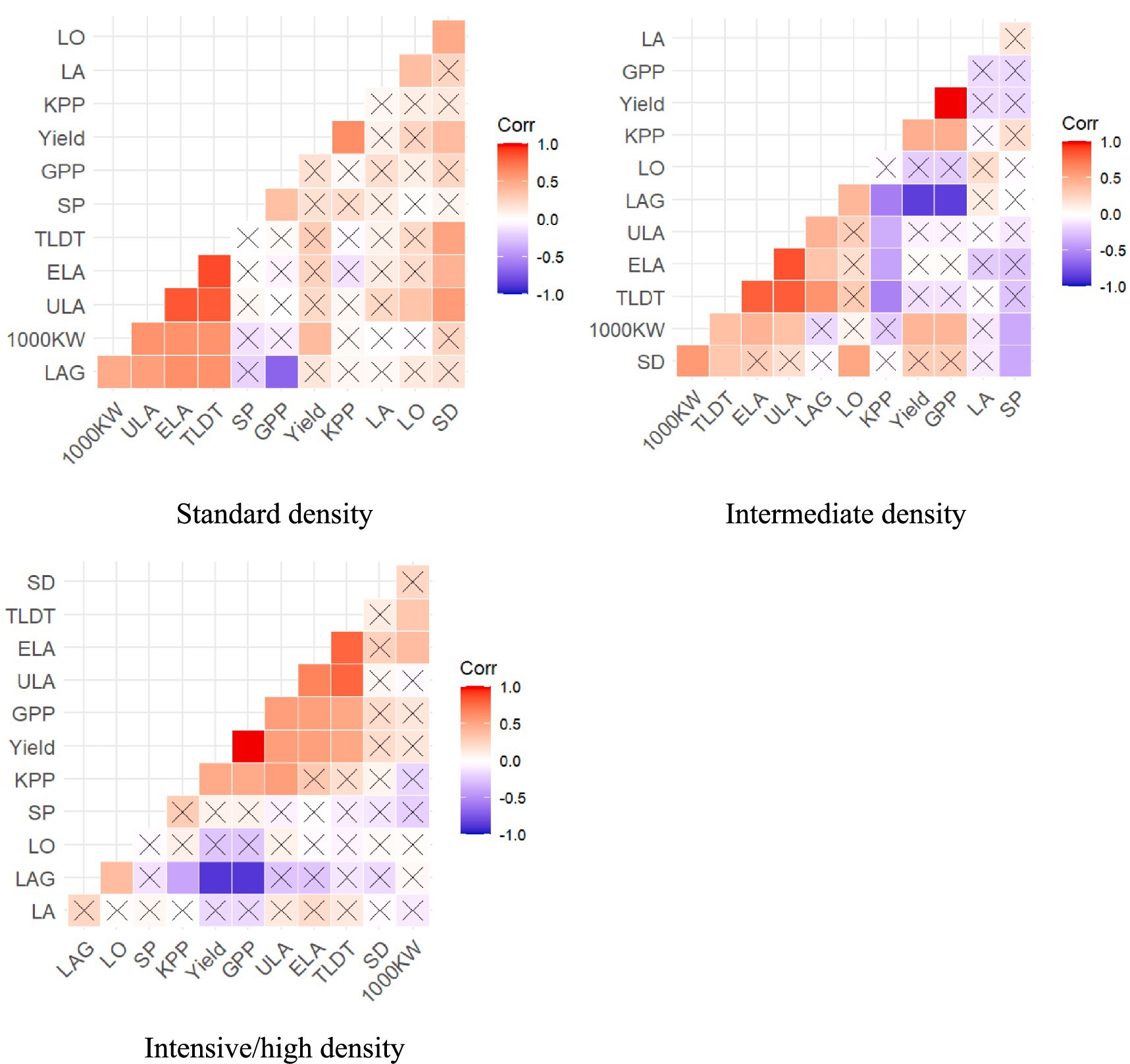 The study aimed to (1) investigate genotype-specific yield responses under standard, intermediate, and intensive planting densities; (2) evaluate correlations among key leaf physiological traits across density levels; and (3) identify resilient hybrids for high-density cultivation through MGIDI assessment.