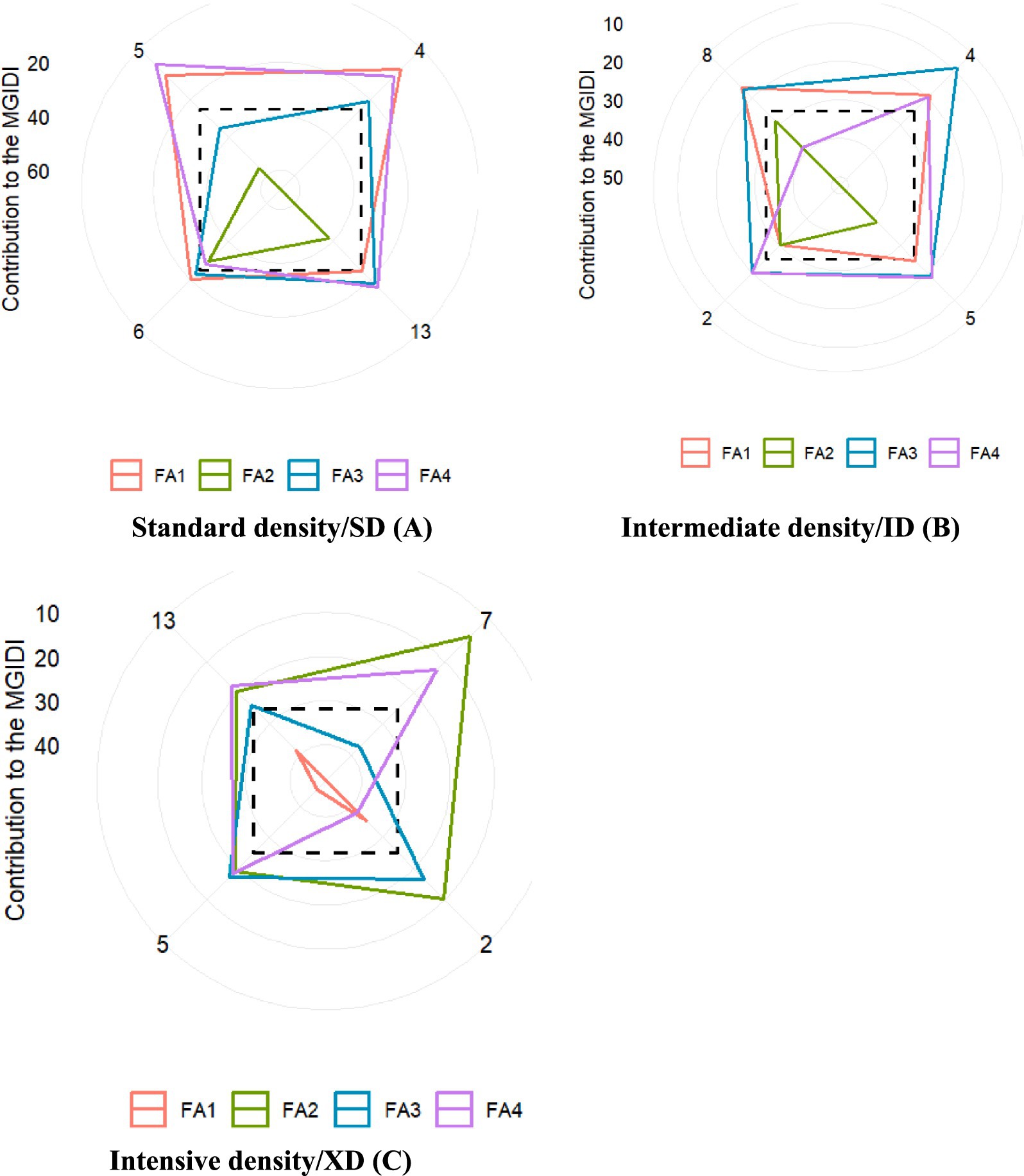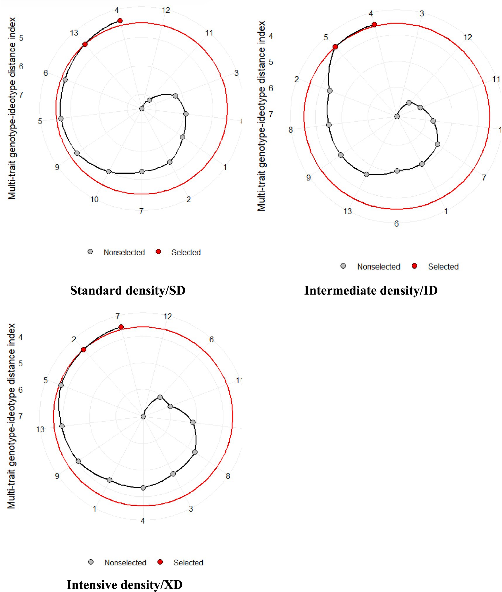 Figure 4 shows a visual comparison of genotype rankings, derived from MGIDI index values, across three population density regimes: Distinct genotypes performance under each density level underscores their adaptability to specific environmental pressures, providing actionable insights for breeding and cultivation strategies. At standard density (SD), genotypes G4, G13, and G6 emerged as optimal candidates, combining robust adaptability with advantageous trait profiles under moderate competition. Notably, G4 reappeared as a top performer under intermediate density (ID), alongside G5 and G2, signaling its consistent stability across varying pressures. This recurrence highlights G4’s broad adaptability, suggesting its suitability for environments with fluctuating planting intensities. Under intensive density (XD), where resource competition peaks, genotypes G7, G2, and G5 demonstrated better resilience. The repeated success of G2 and G5 across both ID and XD conditions further underscores their genetic robustness, positioning them as prime candidates for high-stress agricultural systems. The MGIDI index effectively integrates multi-trait performance, streamlining genotype selection by balancing strengths and weaknesses (Olivoto and Nardino, 2021). While this approach efficiently identifies promising genotypes (e.g., G4, G2, G5), environmental factors may constrain the full expression of genetic potential, necessitating field validation to confirm resilience.