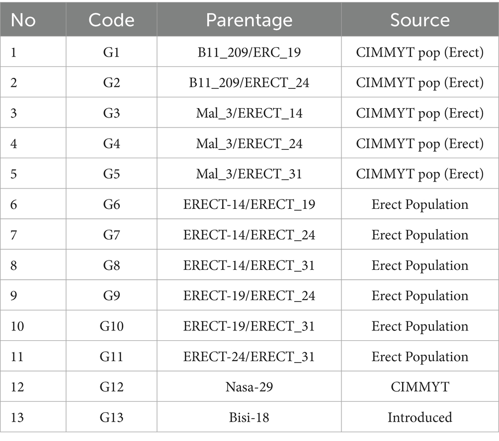 The main plot treatments involved three maize planting densities: standard/SD (± 71,000 plant populations ha−1), intermediate/ID (± 81,000 plant populations ha−1), and intensive/XD (± 95,000 plant populations ha−1). Subplots consisted of 13 hybrid maize genotypes, including 11 advanced experimental hybrids (coded G01–G11) selected through strict criteria prioritizing upright leaf architecture (≤30° leaf angle) and compact canopy structure. Two commercial check hybrids were incorporated: Bisi-18 (G12), an upright-leaved cultivar (leaf angle <25°) and Nasa-29 (G13), a conventional hybrid with a drooping leaf phenotype (leaf angle >45°), serving as contrasting canopy models. Parental lineage and breeding pedigrees of experimental genotypes are detailed in Table 1. Each genotype × density combination was replicated three times, resulting in nine experimental plots per genotype (3 densities × 3 replicates) and a total of 117 plots (13 genotypes × 3 densities × 3 replicates).