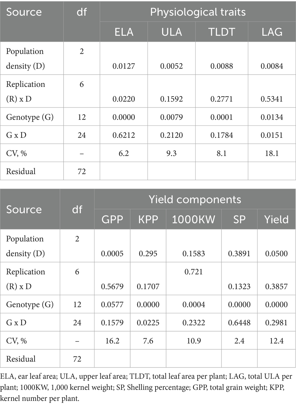 Analysis of variance showed that population density and genotype each exert strong main effects on both canopy architecture and yield components. Increasing planting density significantly affects all four physiological traits ELA, ULA TLDT and LAG. In addition, genotypes had highly significant effects on these traits (all p < 0.05). However, the density × genotype interaction was significant only for total upper leaf area per plant (LAG; p = 0.0151). In terms of yield components, increasing density markedly boosted total grain weight per plant (GPP; p = 0.0005) and grain yield that was on the threshold of significance (p = 0.0500). Density did not significantly affect kernel number per plant (KPP; p = 0.295), thousand-kernel weight (1000KW; p = 0.1583), and shelling percentage (SP; p = 0.3891). Genotype shows highly significant effects on KPP, 1000KW, SP, and grain yield (all p < 0.001). However, the density × genotype interaction was significant only for kernel number per plant (KPP; p = 0.0225). The significant genotype × density interactions for the physiological trait LAG and the yield component KPP demonstrate that different hybrids control their upper canopy leaf area and kernel set in distinct ways under crowding stress.