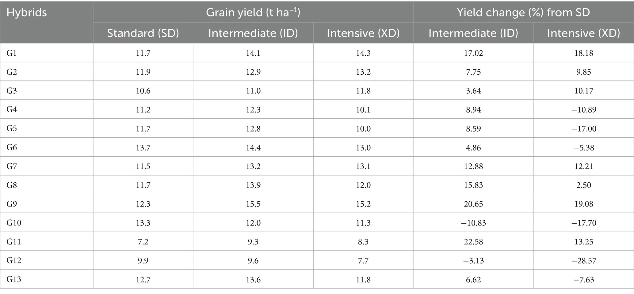 Table 4. Comparison of the top five grain yields with the average for 13 hybrids grown at normal, medium, and high plant densities.
