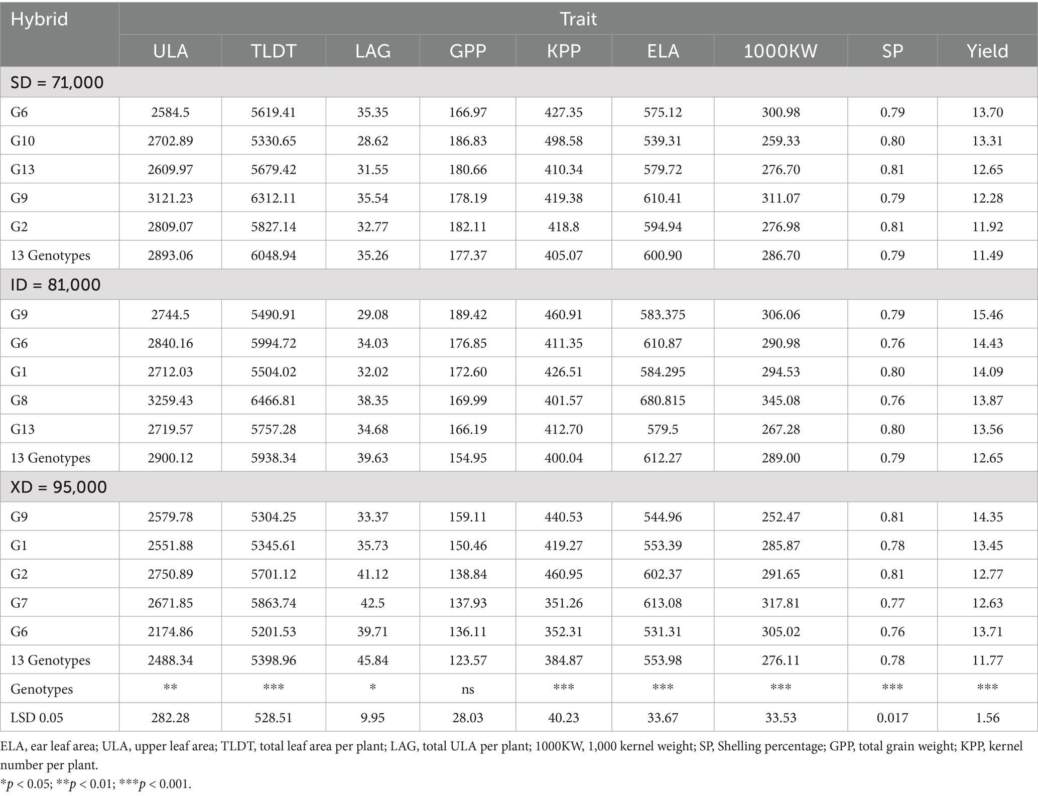 Under intermediate population density, the 13 maize genotypes averaged a total leaf area of 5,938 cm2 and an upper leaf area of 2,900 cm2, producing a mean grain yield of 12.65 t ha−1. Genotype G9 achieved the highest yield (15.46 t ha−1) with moderate leaf areas (upper: 2744.5 cm2; total: 5490.9 cm2). By contrast, G8 exhibited the largest leaf areas (upper: 3259.4 cm2; total: 6466.8 cm2) but yielded 13.87 t ha−1. Genotype G6, which had a total leaf area above the mean (5994.7 cm2), delivered 14.43 t ha−1. Furthermore, as for yield components, G9’s performance was driven by its high kernel number per plant (460.9) and robust 1,000-kernel weight (306.1 g). G6 maintained a strong 1,000-kernel weight (291.0 g) with a slightly lower kernel count (411.4). Although G1 and G8 had fewer kernels per plant both achieved competitive yields through favorable 1,000-kernel weights and efficient shelling percentages (80.7 and 76.3%).