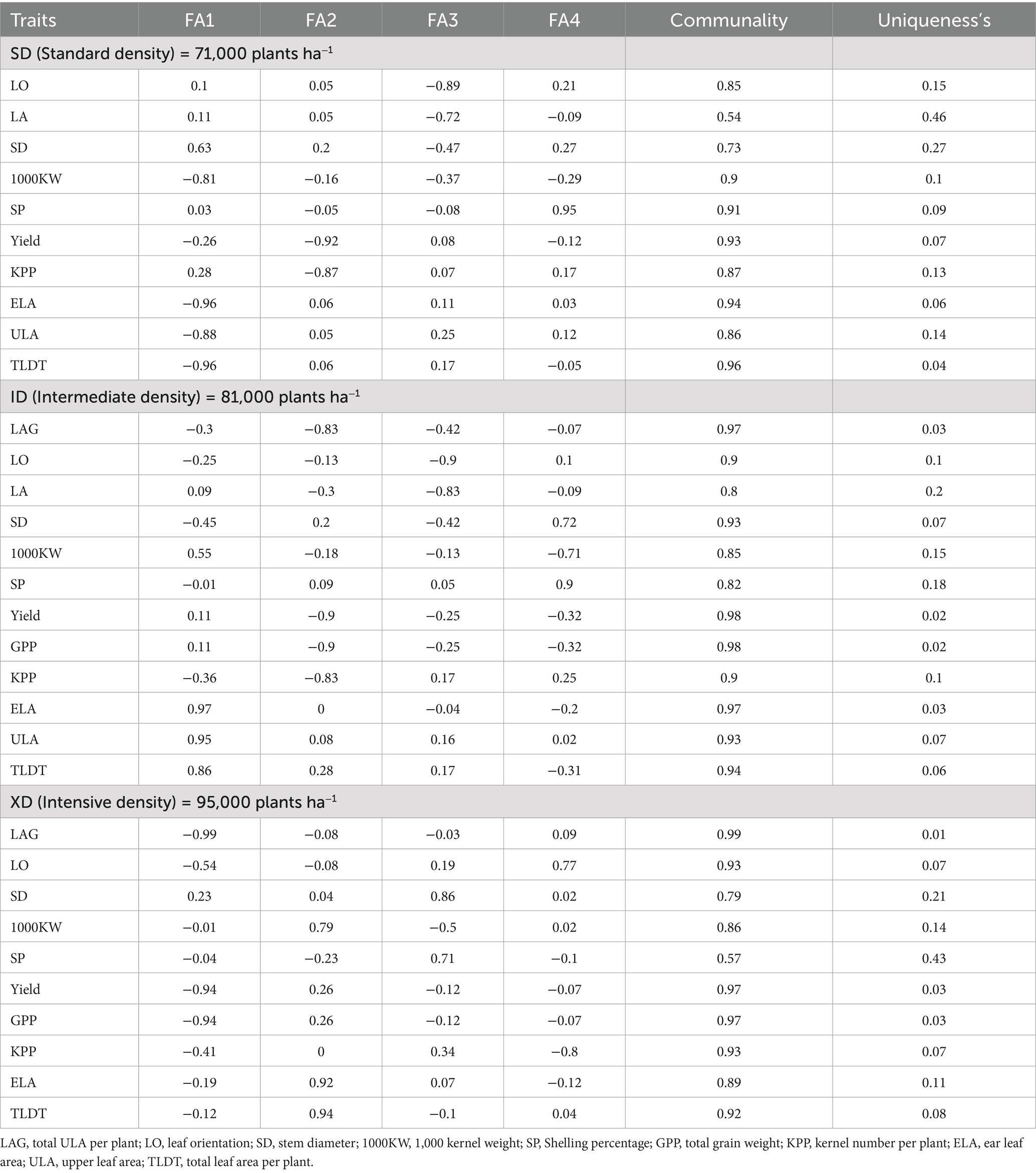 Under high density conditions (95,000 plants ha−1), communalities remained high (0.57–0.99), and four factors persisted with further realignments. Factor 1 turned into a source sink gradient, indicating large negative loadings on total upper leaf area and yield traits with moderate negative leaf orientation, thus reflecting the balance between photosynthetic source and grain-filling. Factor 2 highlighted leaf and kernel size, while Factor 3 joined stem diameter and shelling percentage into a structural crop harvest efficiency. Factor 4 contrasted positive leaf orientation against kernels per plant, again reflecting canopy geometry versus sink capacity.