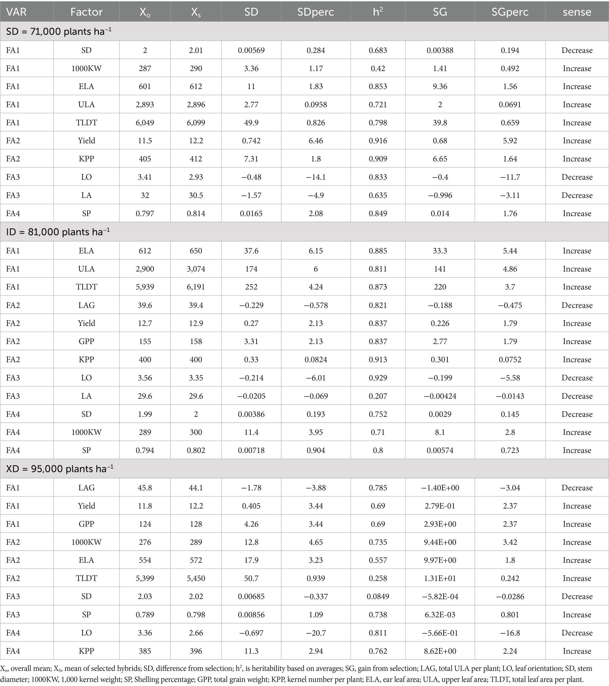 The selection of optimal genotypes was conducted using the multi trait Genotype-Ideotype Distance Index (MGIDI) to integrate multiple trait data (Olivoto and Nardino, 2021). For standard and intermediate planting densities, grain yield was double weighted, and other traits were weighted single. For intensive planting density, grain yield and leaf orientation were weighed double, and the others single. Traits were rescaled using a transformation equation, where new values were defined based on trait-specific gains: for positive gains, traits were scaled between 0 and 100, while negative gains inverted this range. Factor Analysis (FA) reduced data dimensionality, employing the model:
