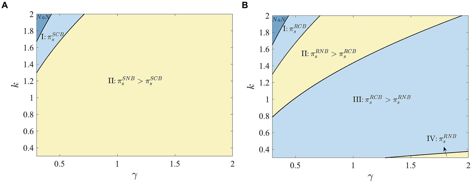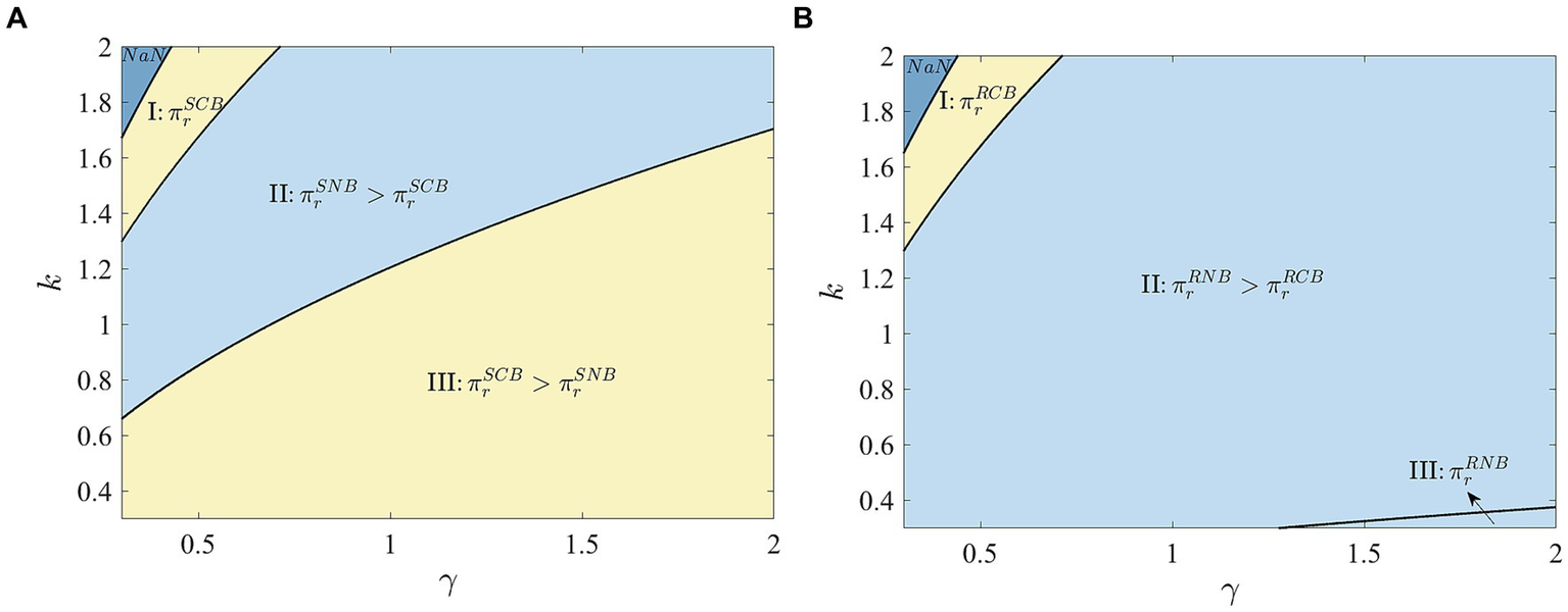 In Region II, it is shown that when both SNB and SCB models are available, ; and when both RNB and RCB models are present, . This indicates that when blockchain is not adopted, the carbon emission reduction level of the 3PL is higher. The reason is that an increase in the R&D cost coefficient for carbon reduction raises the carbon reduction costs for 3PLs. In this case, adopting blockchain adds to the economic burden, causing 3PLs to prefer not using blockchain and instead focus on using limited resources to improve carbon reduction levels.