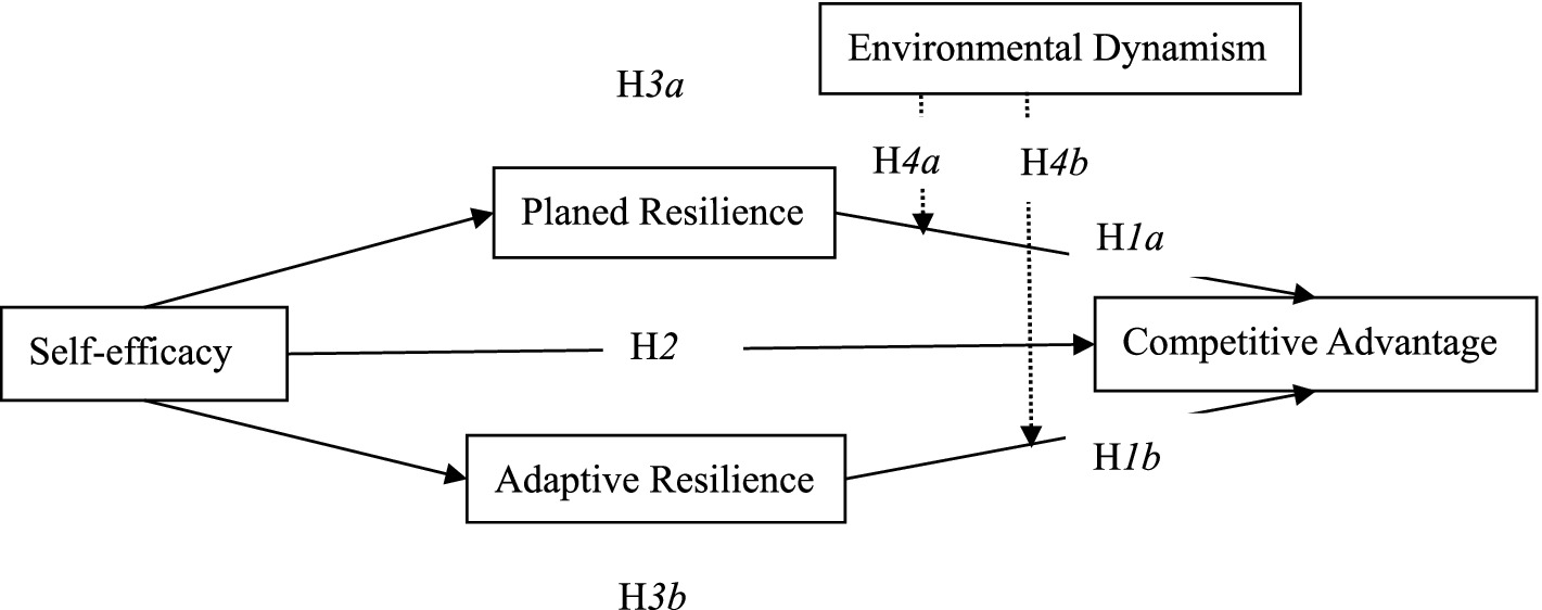 H4b: The mediating effect of adaptive resilience on the relationship between chairpersons’ self-efficacy and cooperative competitive advantage is regulated by environmental dynamism. Through the mediation of adaptive resilience, the indirect positive association between self-efficacy and cooperative competitive advantage is larger when the amount of environmental dynamism is low.