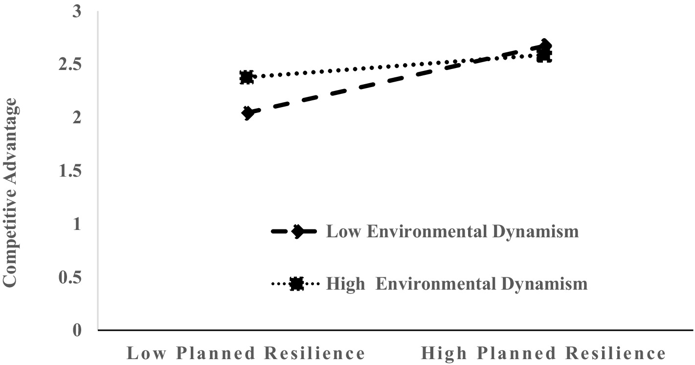 Figure 1. Research framework. Steeper positive slope indicates that higher planned resilience strengthens the positive impact of environmental dynamism on competitive advantage. Flatter slope suggests reduced effectiveness of environmental dynamism when planned resilience is low.