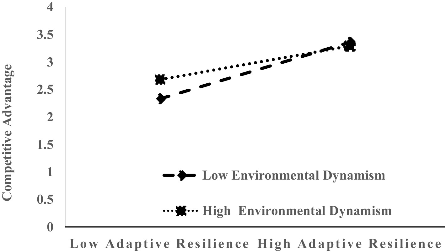 Figure 3. The interactive effect of adaptive resilience and environmental dynamism on competitive advantage.