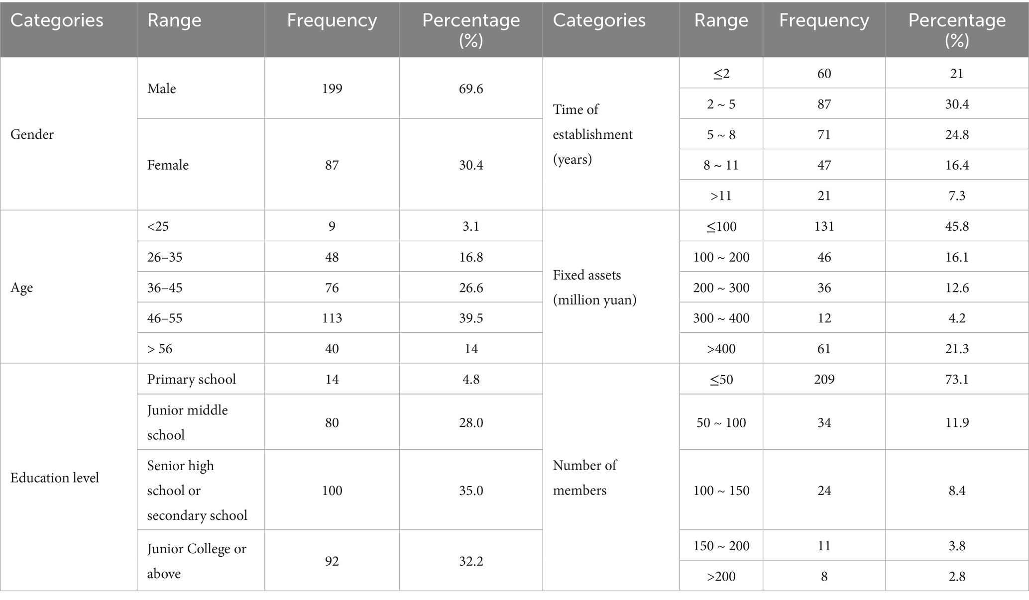Our study comprised two phases: preliminary exploration and formal inquiry. From April to June 2021, pretests were conducted in Guangzhou and Qingyuan (Guangdong Province) to refine the questionnaire. The formal survey was administered from 2 August to 26 November 2021 by two research teams operating in Dabu County, Luoding City, Gaozhou City, and Lianzhou City. Cooperatives were selected via random sampling, and questionnaires were administered through one-on-one interviews with cooperative chairpersons to ensure comprehensive insight into cooperative operations. Finally, we distributed 320 questionnaires and received 286 valid questionnaires, for an effective rate of 91.1%. The descriptive data of respondents are shown in Table 1.