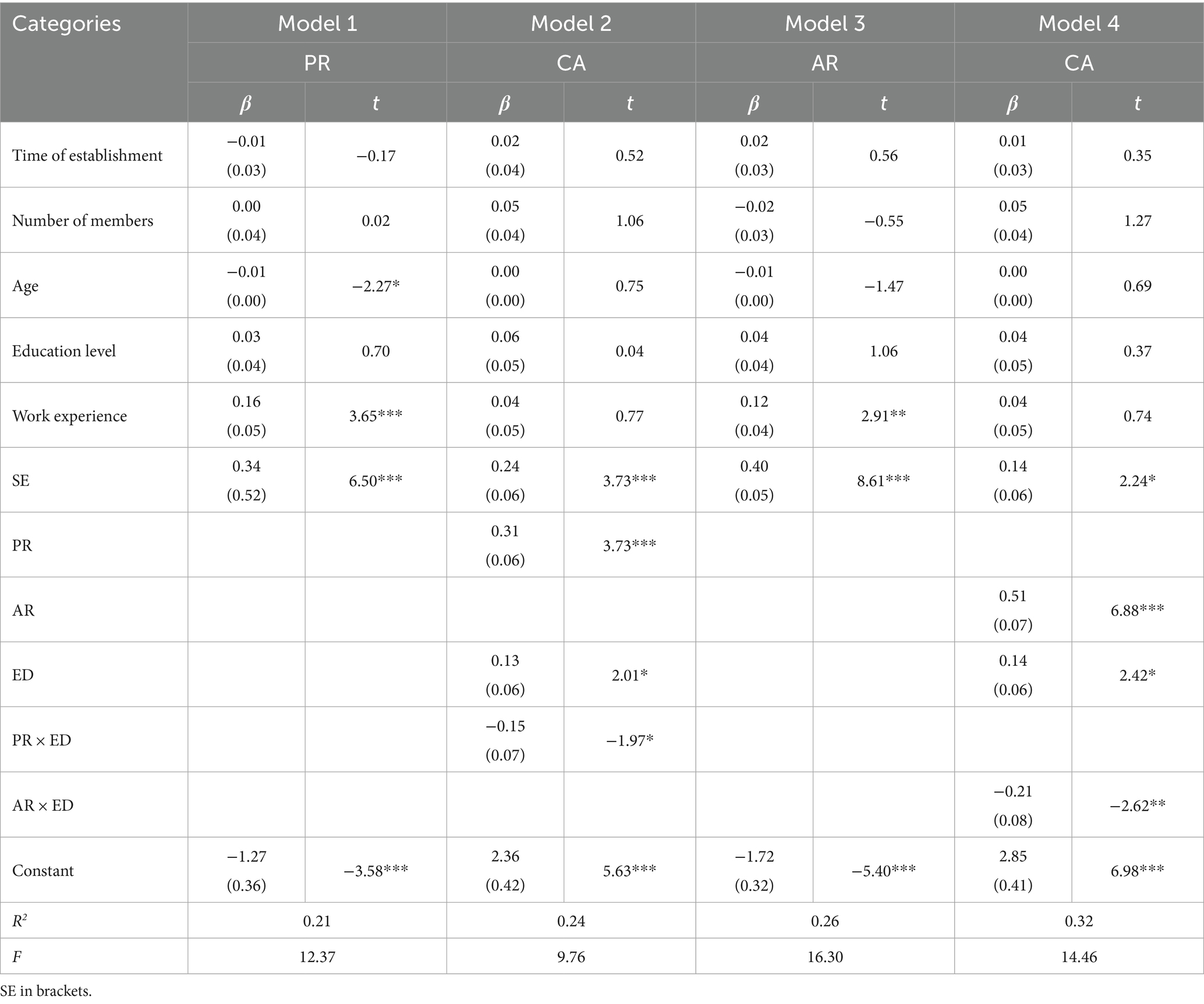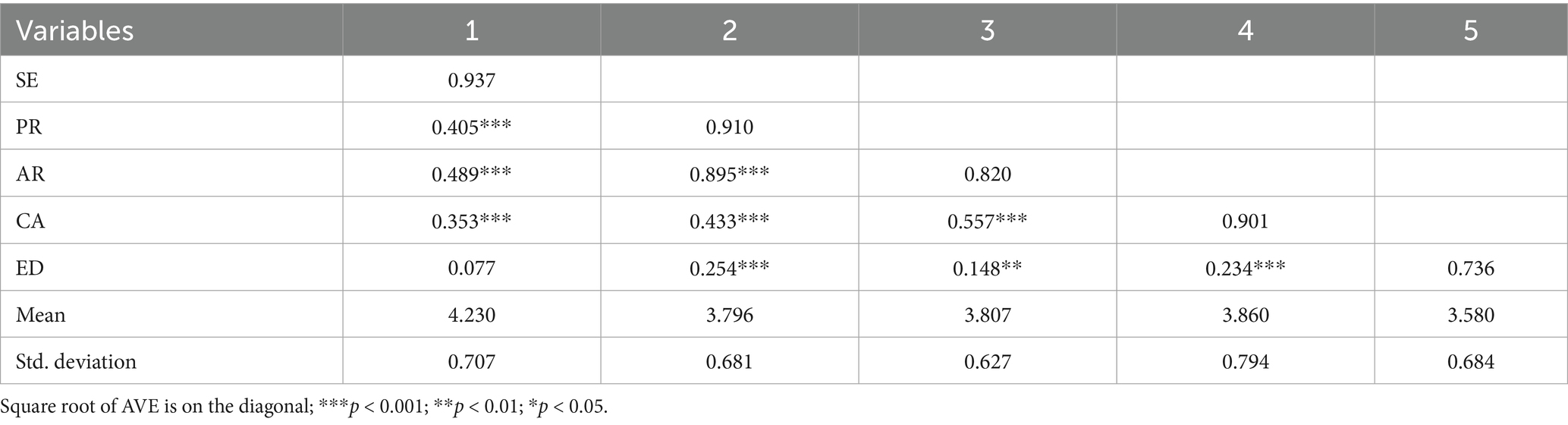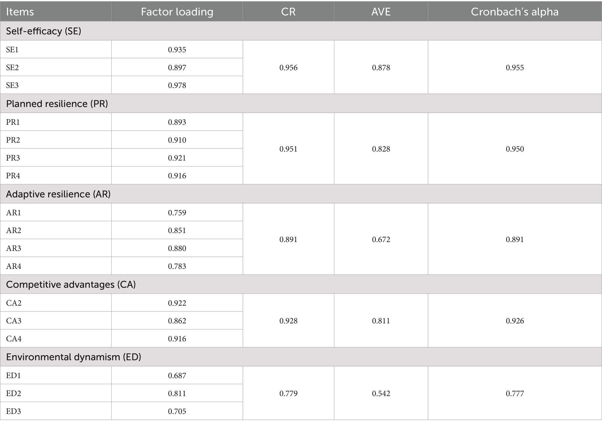 The validity and reliability of the data were evaluated using confirmatory factor analysis. Table 2 presents the outcomes. All constructions have composite dependability (CR) values greater than 0.7, with a range of 0.779 to 0.956. This shows that the theoretical construct may be accurately measured as a component of the structural model (Bagozzi and Yi, 1988). Cronbach’s alpha of the corresponding latent variable after deleting item CA1 increased to higher than 0.7, which was eliminated to enhance the reliability of the scale. The Cronbach’s alpha reliability coefficients for the scales measuring self-efficacy, planned resilience, adaptive resilience, competitive advantage, and environmental dynamism were 0.955, 0.950, 0.885, 0.926, and 0.777, respectively, all surpassing the benchmark of 0.7. This indicates that the scales possess satisfactory reliability. The Average Variance Extracted (AVE) values ranged from 0.542 to 0.878, indicating strong convergent validity. As presented in Table 3, the square root of AVE for each construct exceeds its inter-construct correlations, thereby confirming discriminant validity (Fornell and Larcker, 1981).