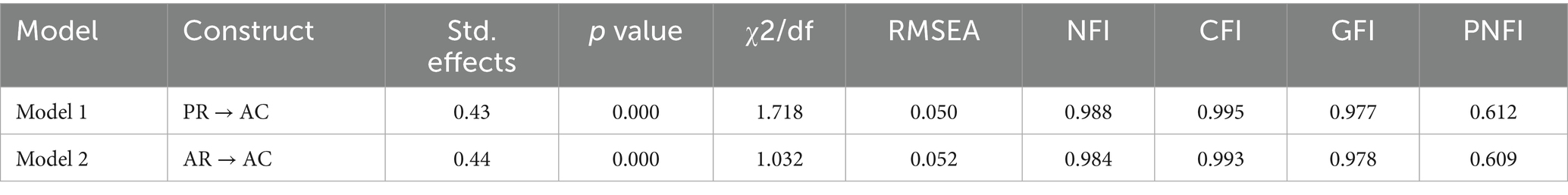 In the first step, two structural equation models were built to estimate the hypothesized relationships between planned and adaptive resilience and the competitive advantages of cooperatives. By focusing on Chinese agricultural cooperatives-an under-researched developing-nation context-this analysis tests whether resilience effects observed in Western studies (e.g., Sobaih et al., 2021) generalize to China. Overall, the proposed model 1 generally has a satisfactory fit with χ2/df = 1.718, GFI = 0.977, NFI = 0.988, CFI = 0.995, and RMSEA = 0.050. The results of model 2 were well fitted, with χ2/df = 1.032, GFI = 0.978, NFI = 0.984, CFI = 0.993, and RMSEA = 0.052.