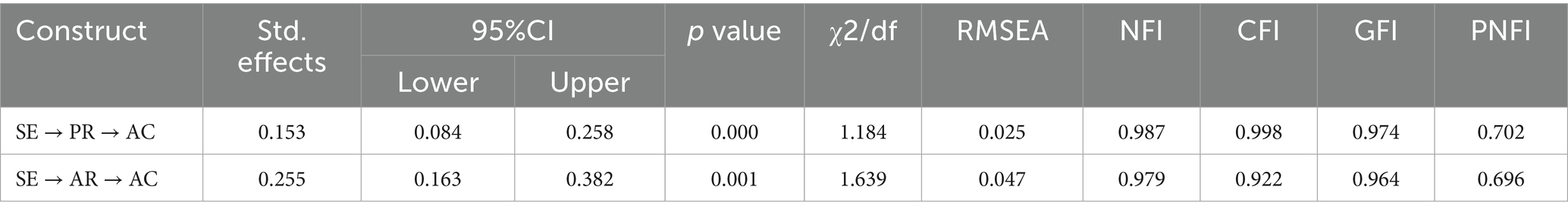 In the third step, planned resilience and adaptive resilience were tested as mediators of the relationship between chairpersons’ self-efficacy and cooperative competitive advantage. The planned resilience mediation model exhibits acceptable fit (χ2/df = 1.264, GFI = 0.969, NFI = 0.984, CFI = 0.997, RMSEA = 0.030), as does the adaptive resilience mediation model (χ2/df = 1.639, GFI = 0.964, NFI = 0.979, CFI = 0.922, and RMSEA = 0.047).