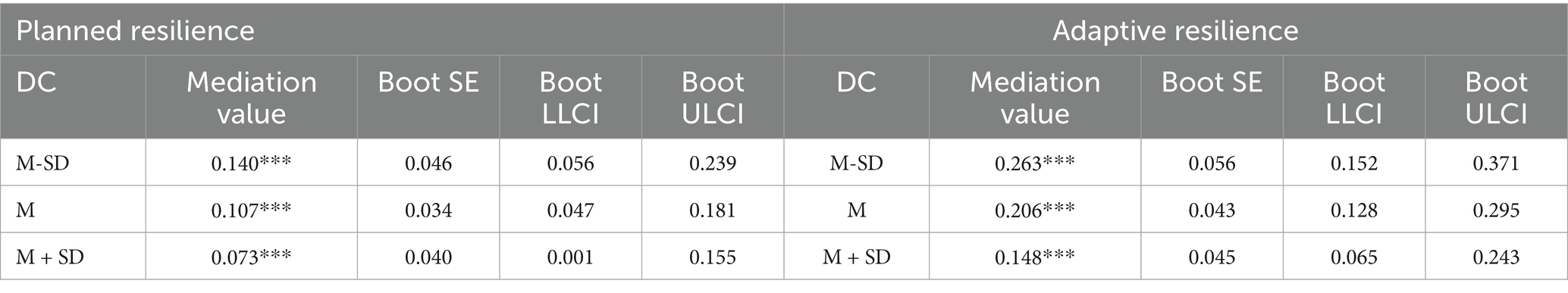 Next, we probed the moderated mediation across three levels of environmental dynamism (mean±1 SD). As shown in Table 7, the mediating effect of planned resilience on the relationship between chairpersons’ self-efficacy and competitive advantage was found to be positively significant at all three levels of environmental dynamism. These results corroborate moderated mediation findings in other sectors (Prayag and Dassanayake, 2023) but run counter to assertions that planned resilience’s indirect effect remains constant across varying environmental conditions (Wulandhari et al., 2022). Similarly, an analysis was performed to assess the moderating influence of environmental dynamism on the mediating role of adaptive resilience between chairpersons’ self-efficacy and competitive advantage. The results shown in Table 6 reveal that environmental dynamism significantly moderates the indirect effect of chairpersons’ self-efficacy on competitive advantage through adaptive resilience. This outcome supports earlier evidence that adaptive resilience’s benefits diminish under turbulent conditions (Hua and Brown, 2024) and contradicts views that adaptive resilience’s mediation effect is invariant to environmental context (Borda-Rodriguez et al., 2016). Consequently, both Hypothesis 4a and Hypothesis 4b are substantiated. Among the control variables, chairpersons’ work experience is significantly related to planned resilience (β = 0.16, p < 0.001) and competitive advantage (β = 0.12, p < 0.01).