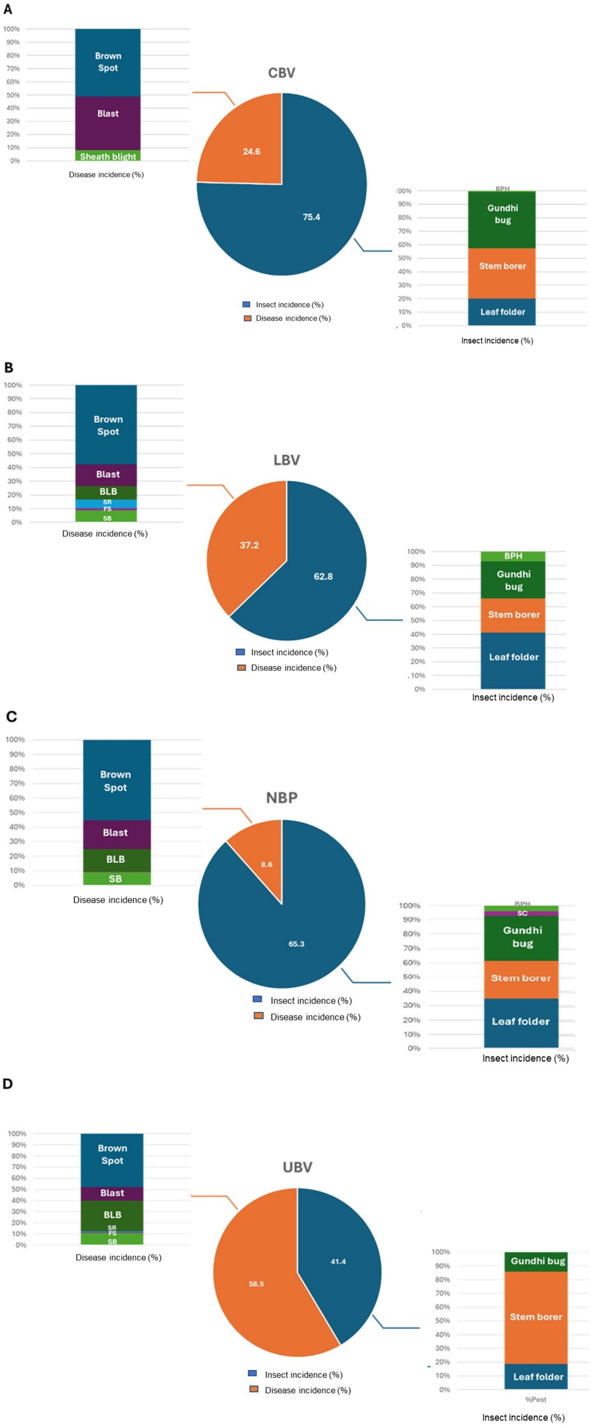 For all rice diseases, including both systemic (bacterial blight—Xanthomonas oryzae pv. oryzae; sheath blight—Rhizoctonia solani Kühn; sheath rot—Sarocladium oryzae; and false smut—Ustilaginoidea virens) and local infection (blast—Magnaporthe oryzae; brown spot—Bipolaris oryzae), observations were recorded as percent disease incidence by counting the number of infected hills and the total number of hills per plot. The disease observations represented the incidence, whereas disease severity (e.g., lesion size, affected area, or rating scales) and intensity were not recorded. The data collected on incidence provides us an estimate on the proportion of insect/disease occurrence and does not provide indication on the severity of the disease or insect attack. Future field-based studies should aim to include intensity of plant damage, by incorporating quantitative parameters to allow a more comprehensive evaluation of insect-disease impact and dynamics.