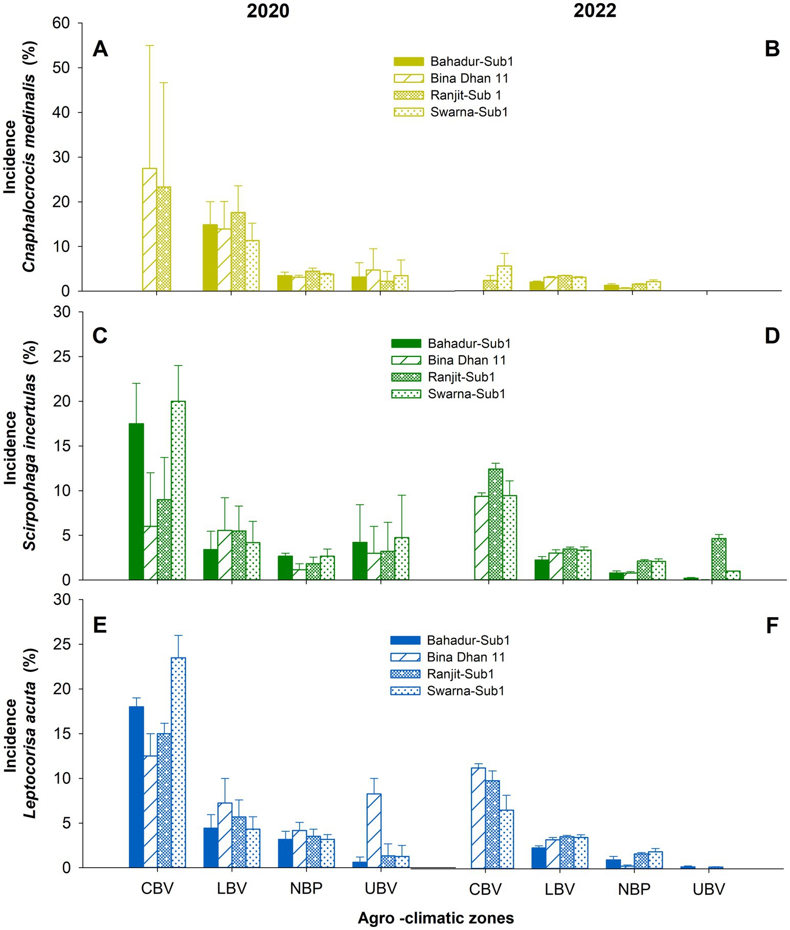 Figure 3. Results (mean ± SE) of the incidence of the predominant rice insect pest [(A,B) Cnaphalocrocis medinalis, (C,D) Scirpophaga incertulas, and (E,F) Leptocorisa acuta] from four agro-climatic zones of Assam (CBV, LBV, NBP, and UBV). Samplings were performed during the Sali season of 2020 (A,C,E) and 2022 (B,D,F).