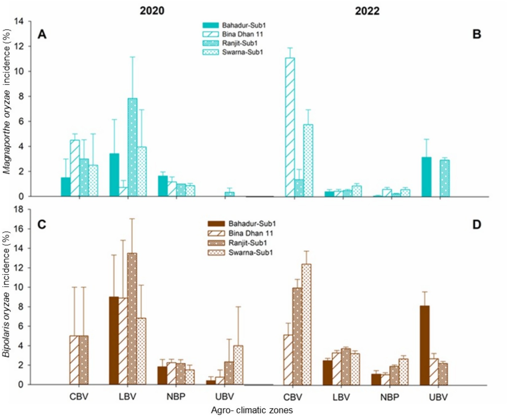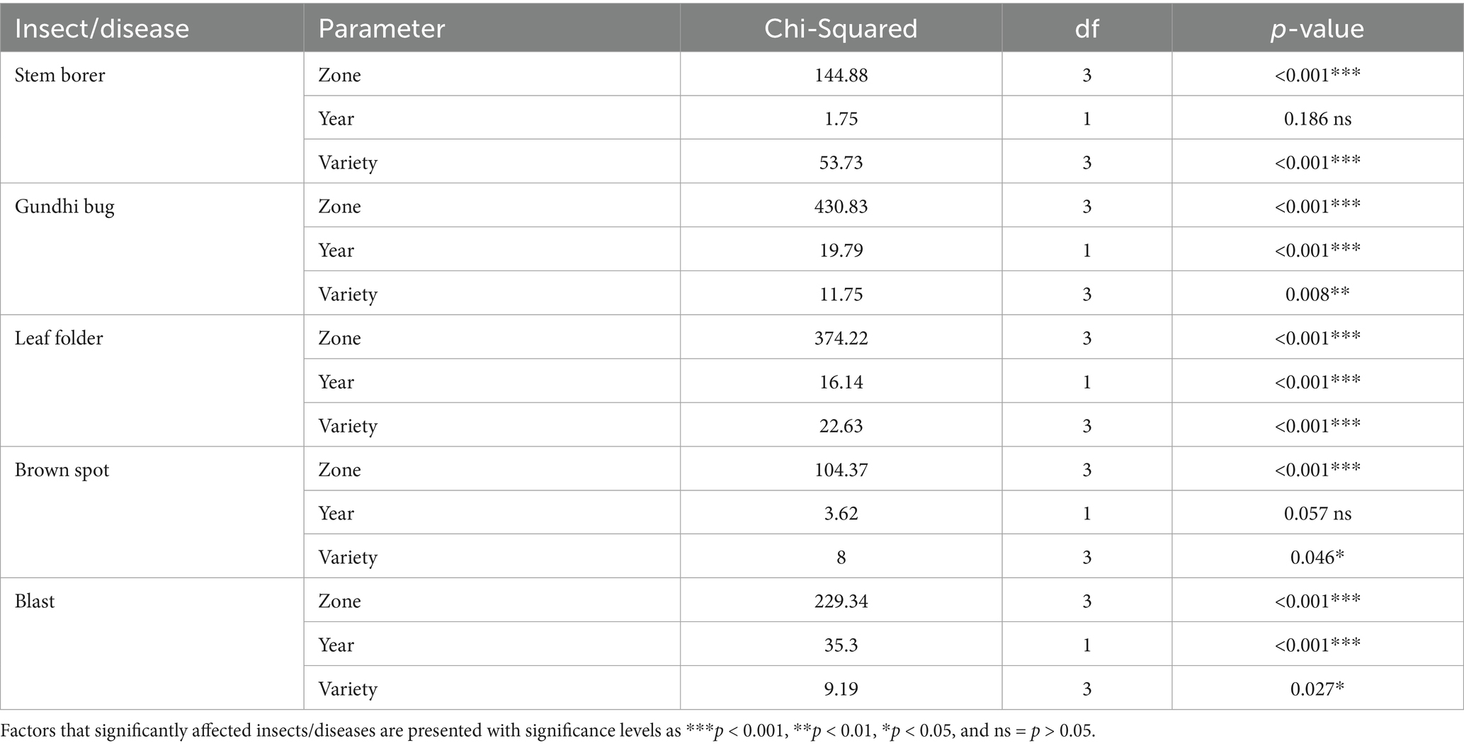 Table 3. Statistical analyses for each of the evaluated insect and disease incidence that was observed across four agro-climatic zones of Assam (CBV, LBV, NBP, and UBV) cultivated with four Sub1 rice varieties (Bahadur-Sub1, Bina Dhan 11, Ranjit-Sub1, and Swarna-Sub1) and recorded for 2 years (2020 and 2022).