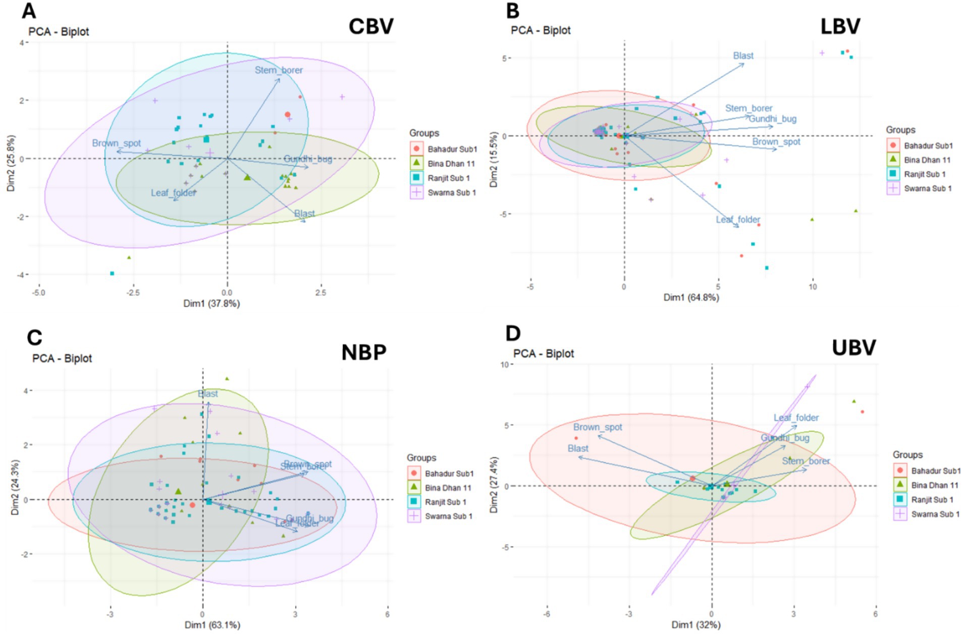 Figure 5. Results of the principal component analyses (PCA) for each of the agro-climatic zones of Assam [(A) CBV; (B) LBV; (C) NBP; (D) UBV] that indicate similarities and dissimilarities between observations of the rice varieties (Bahadur-Sub1, Bina Dhan 11, Ranjit-Sub1, and Swarna-Sub1) with points and ellipses, and infer the relationship between insect-pests (Scirpophaga incertulas, Leptocorisa acuta, and Cnaphalocrocis medinalis) and diseases (Bipolaris oryzae and Magnaporthe oryzae) with arrows. The angle between arrows indicates the correlation between variables; thus, <90° = positive correlation, ±90° = no correlation, close to 180° = negative correlation (gundhi bug—Leptocorisa acuta; stem borer Scirpophaga incertulas; leaf folder—Cnaphalocrocis medinalis; blast—Magnaporthe oryzae brown spot—Bipolaris oryzae).