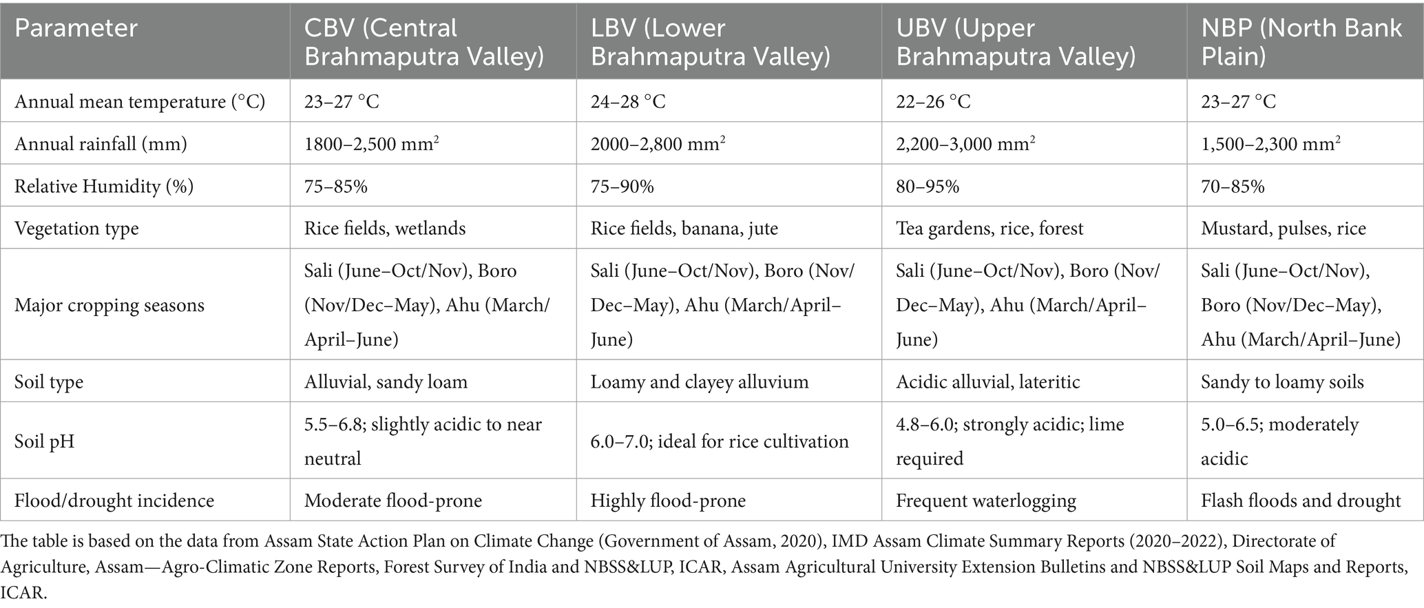 Agro-climatic zone refers to geographic regions with similar climatic conditions, soil type, cropping intensity, and production (FAO). Assam state of India has six agro-climatic zones (Konjengbam et al., 2021), of which the present study covers four major agro-climatic zones, i.e., CBV, LBV, UBV, and NBP zone (Figure 1), and their major distinct features are mentioned in Table 1. The CBV has moderate rainfall with warm climate, whereas LBV is the wettest zone, and highly flood-prone; UBV features cooler temperatures and excessive rainfall, whereas NBP is characterized by erratic rainfall, flash floods, and drought.