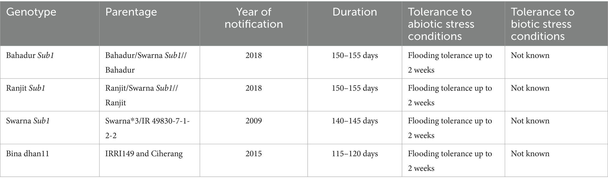 Rice is a critical staple food crop for more than half of the world’s population and is grown under diverse agroecological zones across the world. Rice crop is affected by many biotic and abiotic stress factors, of which water lodging/flooding is a major abiotic constraint in rain-fed low-lying and deep-water rice growing regions, affecting crop growth, production, and yield. In recent years, stress-tolerant rice varieties (STRVs), introgressed with the submergence-tolerant Sub1 gene, have been developed and promoted in several flood-prone regions of South and South-East Asia (Ismail et al., 2013). Sub1 introgressed rice varieties are capable of withstanding flooding conditions for periods ranging from 7 to 14 days, exhibiting higher yields than the popular local varieties and do not incur yield penalties under normal conditions (Dar et al., 2018).