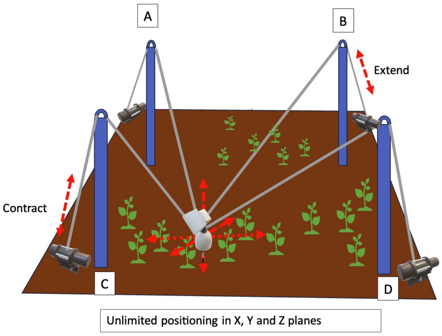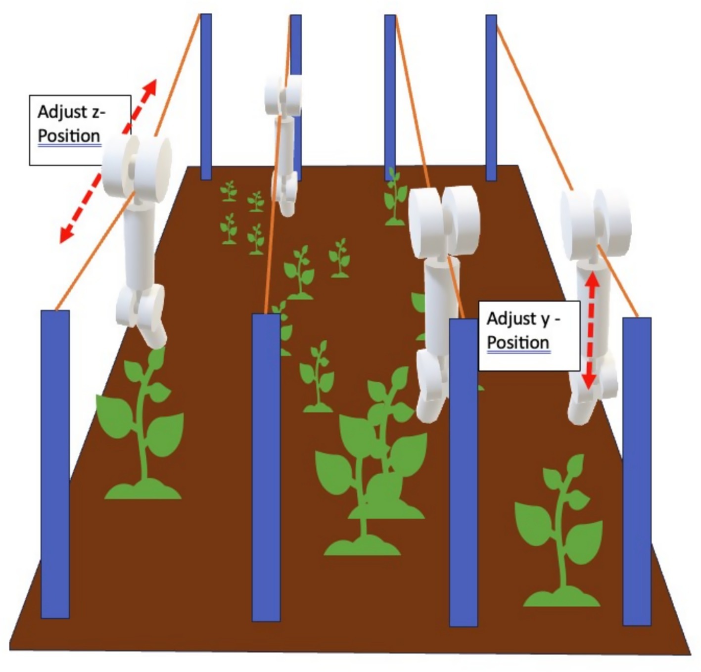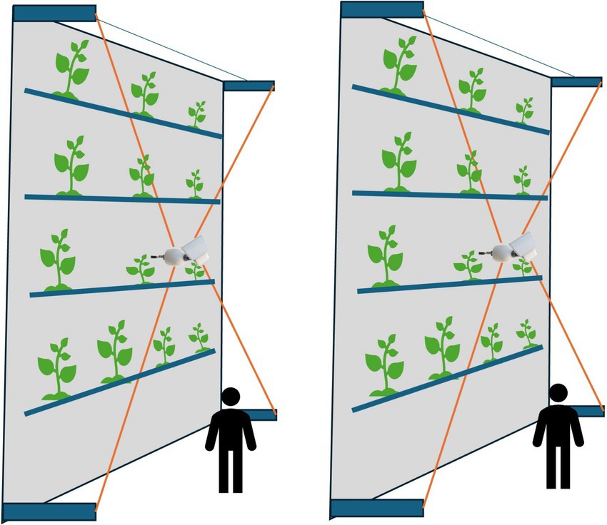 The potential of different styles of Cartesian and gantry systems for traditional protected horticulture has been explored (Belforte et al., 2006), identifying that gantries can allow for precise plant positioning without complex kinematics. An experimental, Open Source system (Takara et al., 2021), uses a single gantry to move two separate manipulators both above and below plants to monitor and weigh soil-grown vertically-farmed plants.