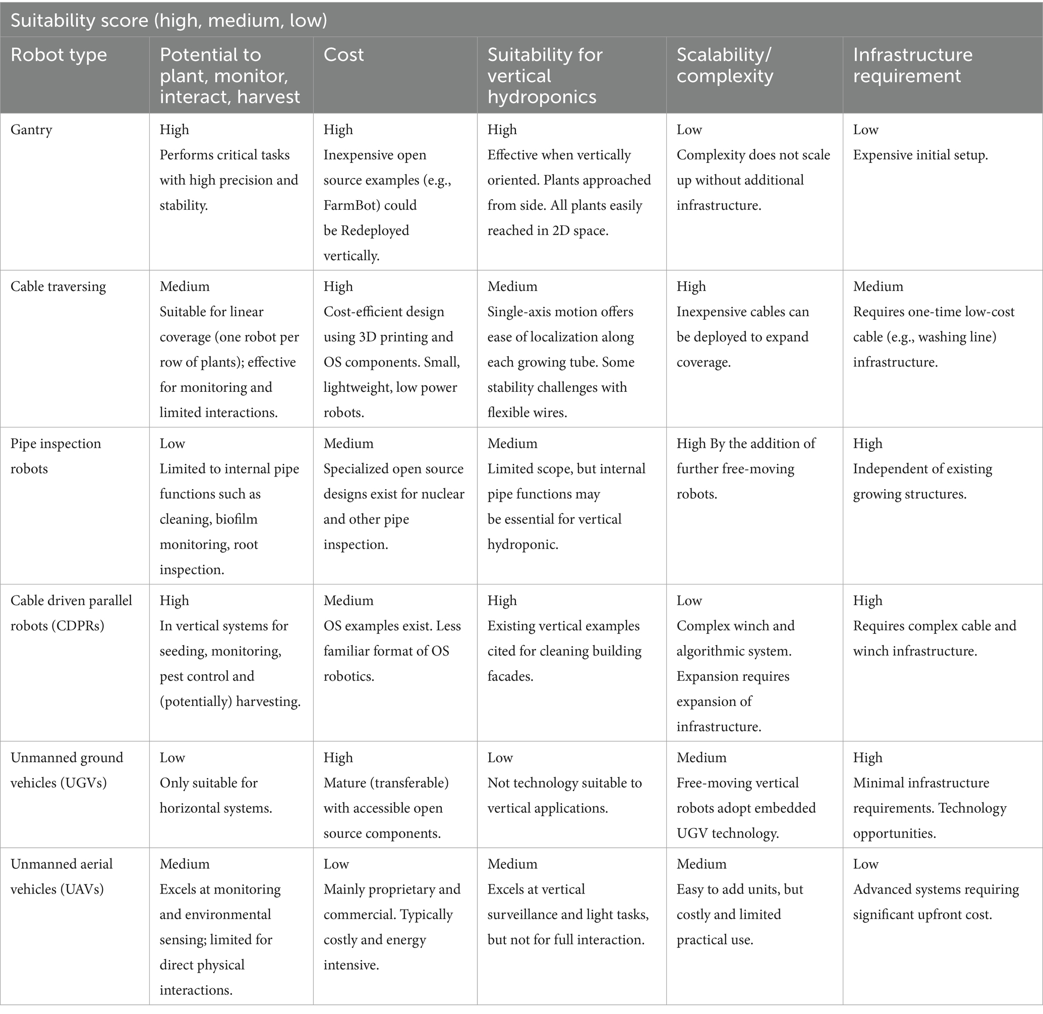 Given the space constraints and safety considerations of urban horticulture, miniature robots—ranging from 50 to 500 mm—offer the most practical scale for general deployment. Smaller, and larger robots may find a place too—however the more specialized components, construction, power requirements, build costs and maintenance makes them less appealing than those built from Commercial Off-The Shelf Components (COTS), the use of which has gained traction in many fields of engineering (O’Halloran et al., 2017), and even the space industry (Hodson et al., 2022).