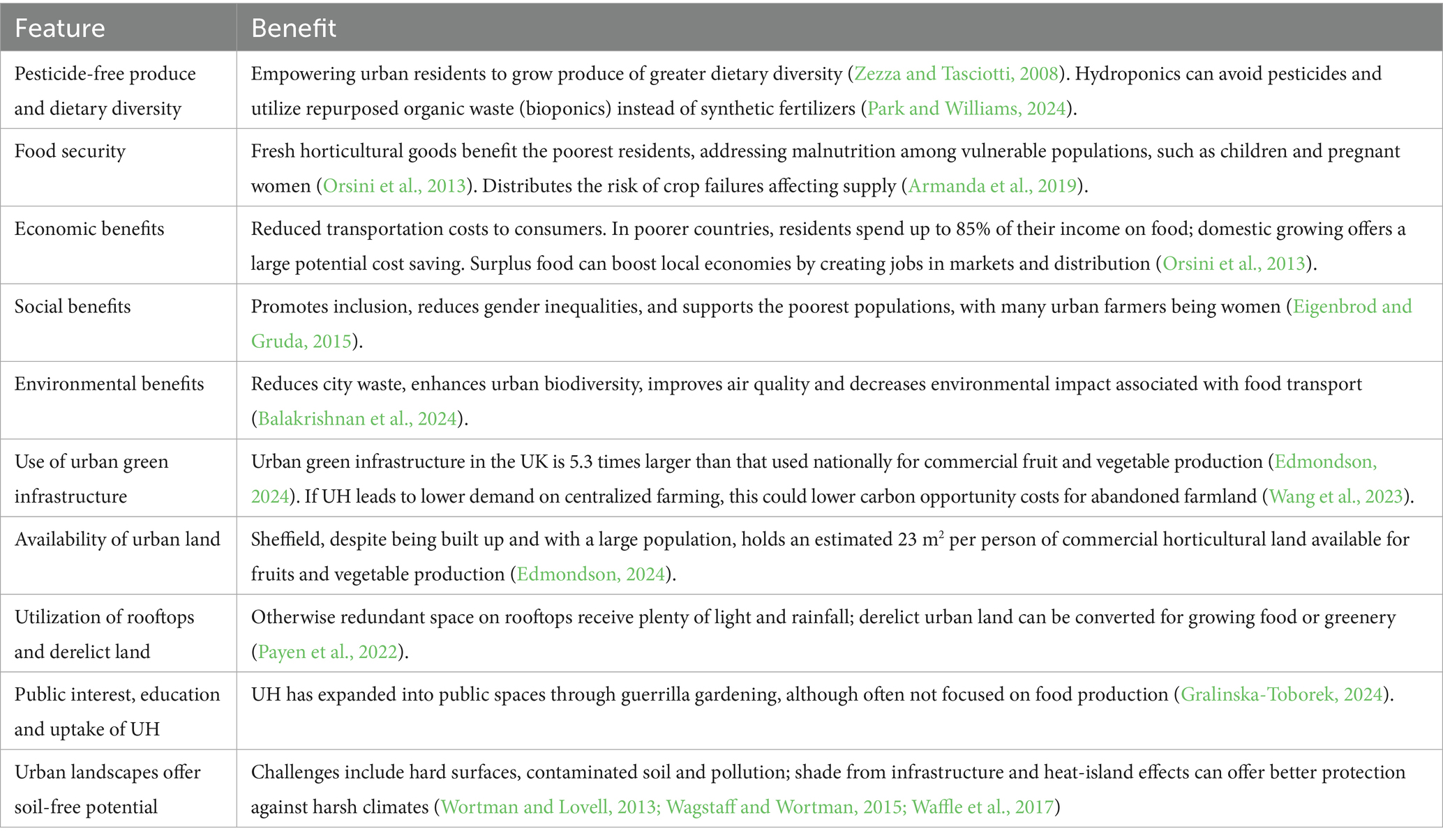 Urban agriculture is the production of crops and livestock within cities and towns (Zezza and Tasciotti, 2010); urban horticulture (UH) specifically focuses on the cultivation of edible plants such as fruits and vegetables (Congreves, 2022). Utilizing the unique, structural constraints of urban environments, particularly when adopting soil-free growing, may encourage the repurposing of derelict, hard-standing and underutilized spaces such as rooftops, building facades and balconies (Beacham et al., 2019). Efficient use of otherwise redundant space, and a growing awareness of the benefits of UH (summarized in Table 2) provides an incentive for exploring automation to accelerate UH uptake, such that it becomes a mainstream contributor to food security in line with the UN’s Sustainable Development Goal 2 (United Nations Department of Economic and Social Affairs, 2024). Once a niche concept, the importance of UH is now recognized at a global, strategic level for addressing food security (Figueres and Rivett-Carnac, 2020; Armanda et al., 2019).