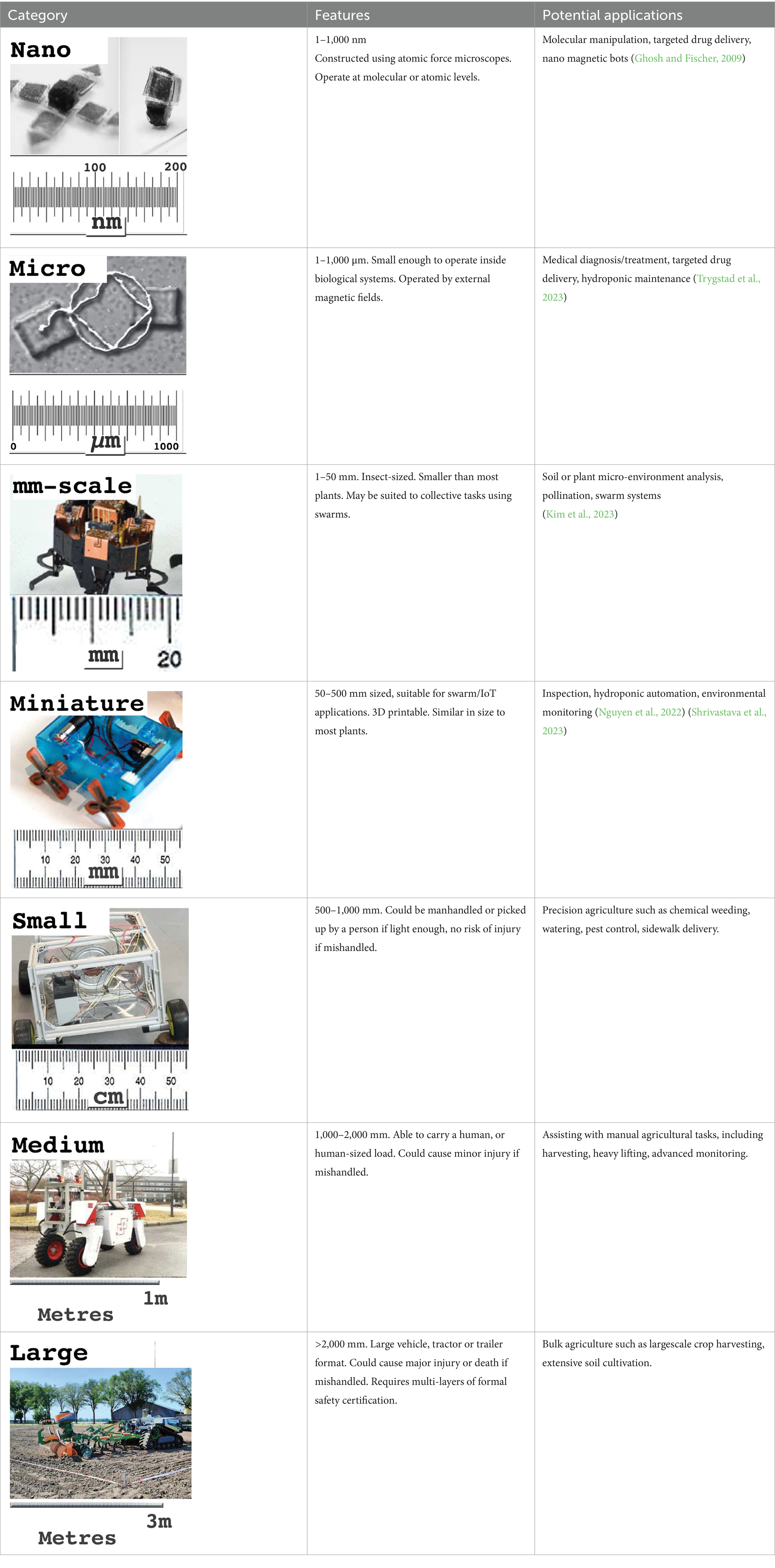 Robots are typically classified by mobility, interaction method, or intended function (Jahn et al., 2020), yet these taxonomies often overlook key physical attributes such as shape, size or weight. The U. S. Navy classifies unmanned vehicles primarily by weight; small (less than 400 lb), lightweight (400 lb. up to 1 ton), medium (1–15 tons), and large (greater than 15 tons)—demonstrating that weight, regardless of physical form, in some domains serves as a more helpful criterion (Turner, 2019). In urban horticulture, where space can be constrained and large, heavy robots could be impractical or pose a danger to humans, a robot’s physical dimensions become a priority. For example, research of seed-sowing robots may initially appear promising until their tractor-size dimensions discount them. For reviewing available technologies, we start with a categorization of robots of nano & micro, millimeter-scale, miniature, small, medium and large, which tend to align their capabilities with the diverse tasks and compact settings encountered in this field (Table 3).