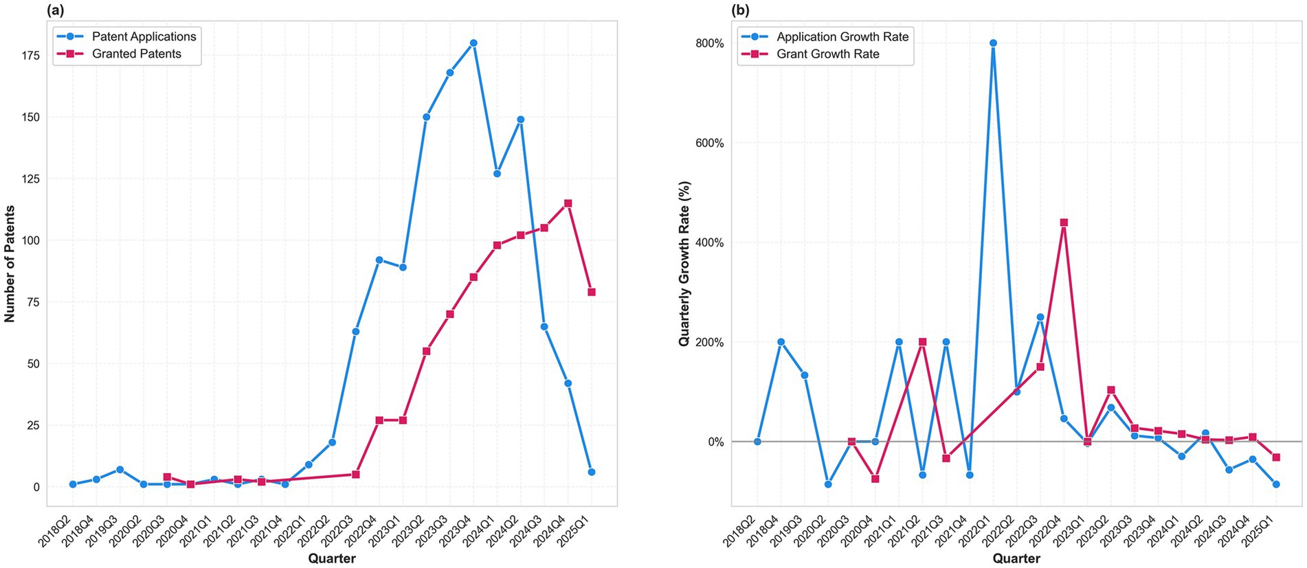 A pivotal transition occurred in 2022, with application volumes surging from 9 in Q1 to 92 in Q4, peaking at an 800% quarterly growth rate (2022Q1), marking the sector’s entry into an innovation boom phase. This shift correlated strongly with post-pandemic market expansion, changing consumption patterns, and accelerated capital inflows. Concurrently, patent grants demonstrated remarkable growth, escalating from 5 in 2022Q3 to 27 in 2022Q4 (440% growth), signifying the maturation of early-stage applications into validated intellectual property.